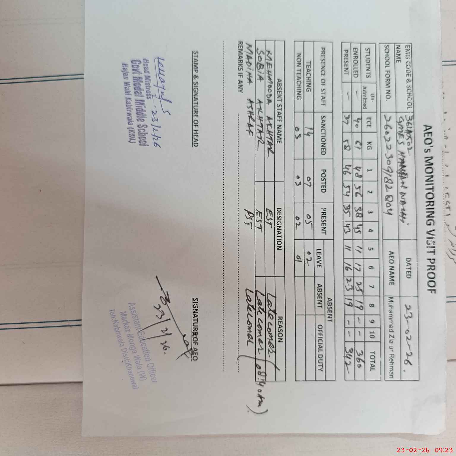| Attendance Register | Head Teacher | MEA with School | Visit Proof |