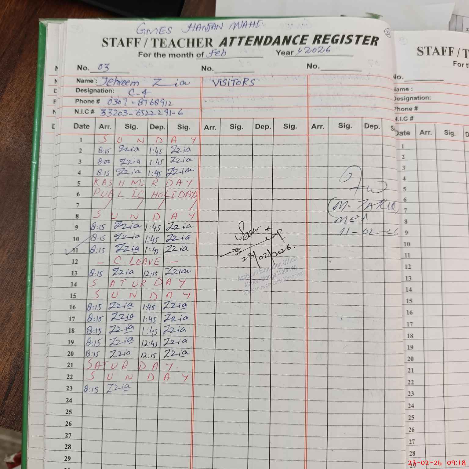 | Name: SH**** GU**** Designation: (School Headmaster's/Headmistress's) S.S.T.(G) Phone/Cell Number: 03**** |