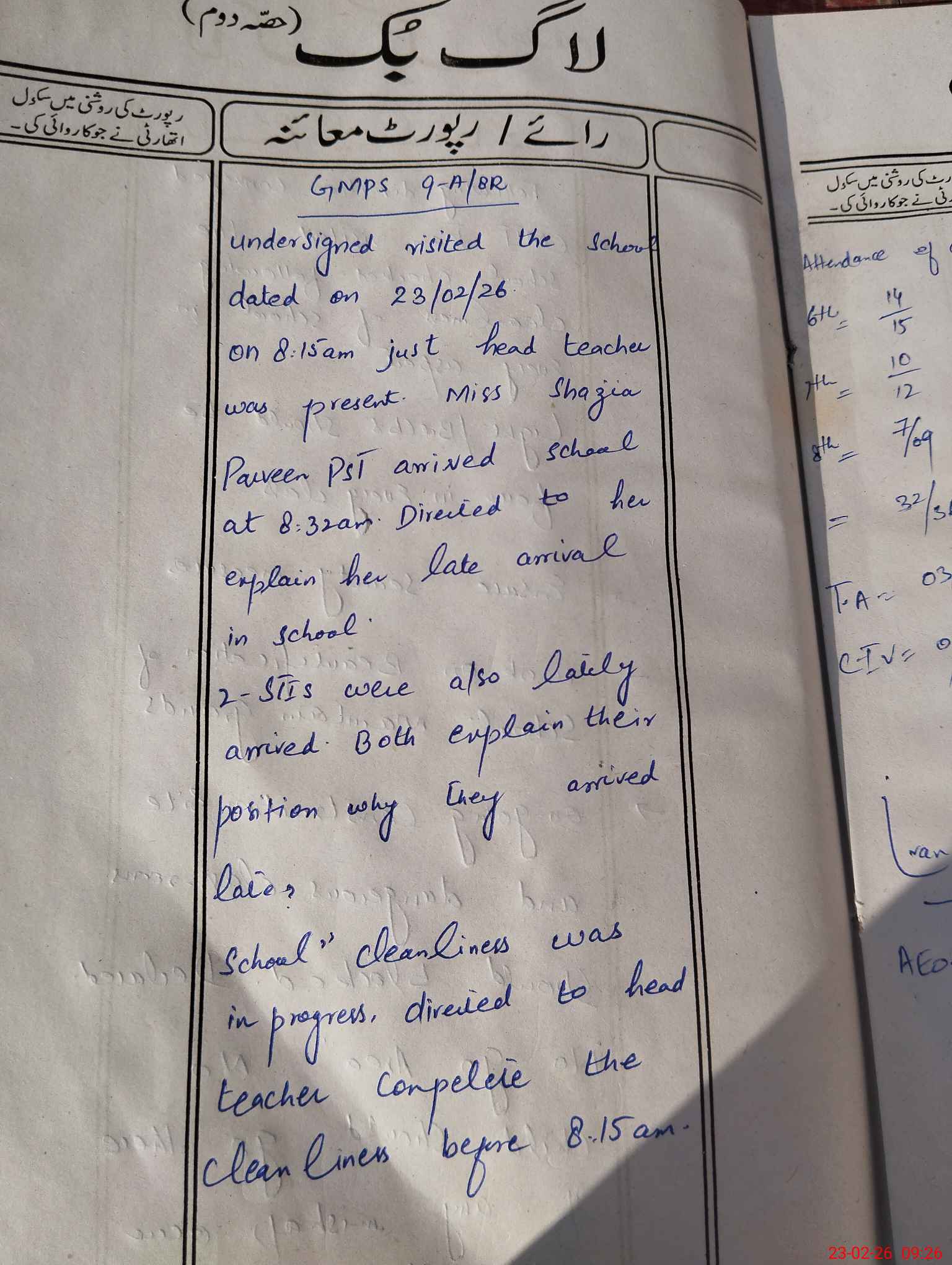 | Attendance Register | Head Teacher | MEA with School | Visit Proof |