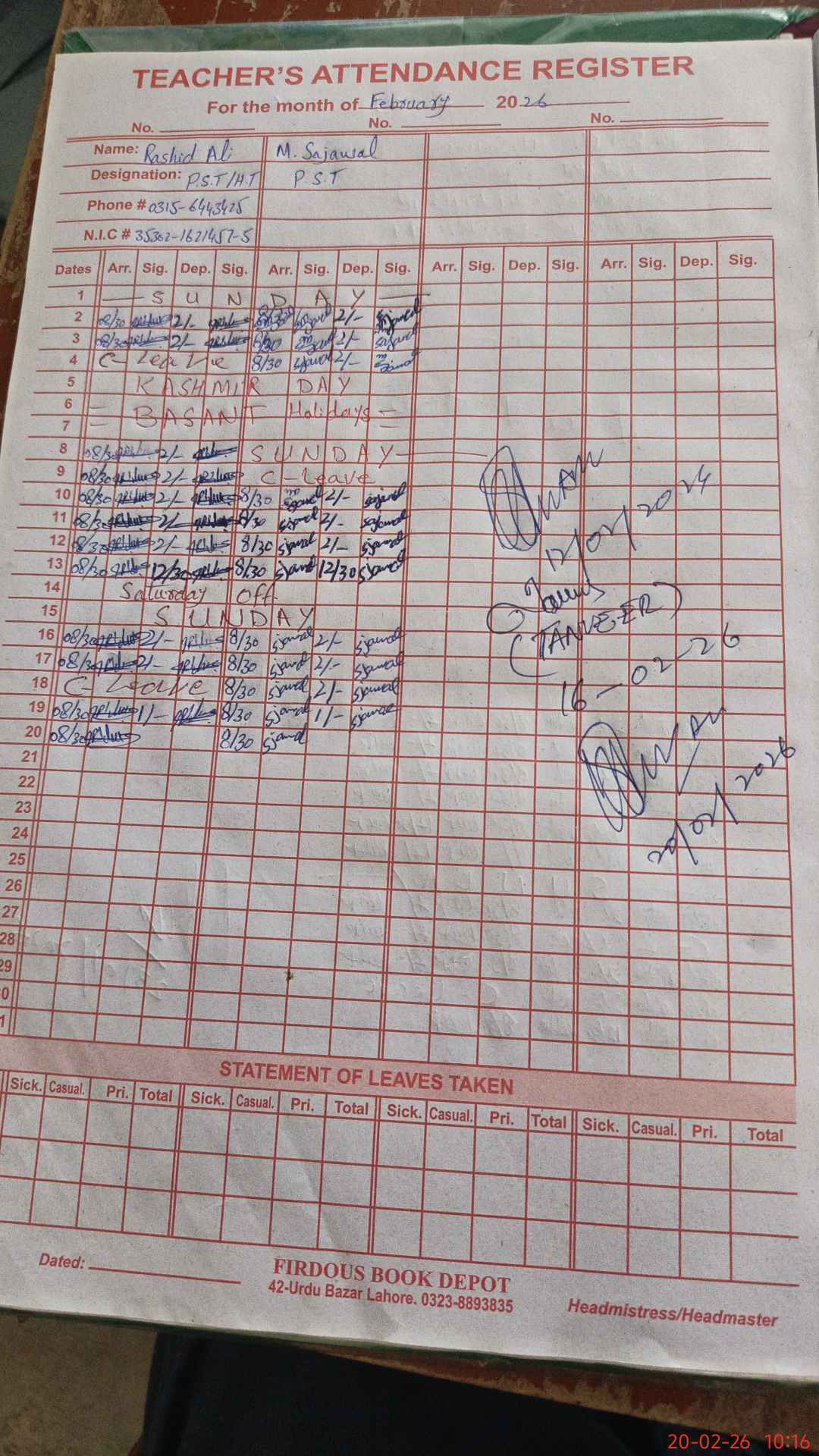 | Name: Ra**** Al**** Designation: (School Headmaster's/Headmistress's) PST Phone/Cell Number: 03**** |