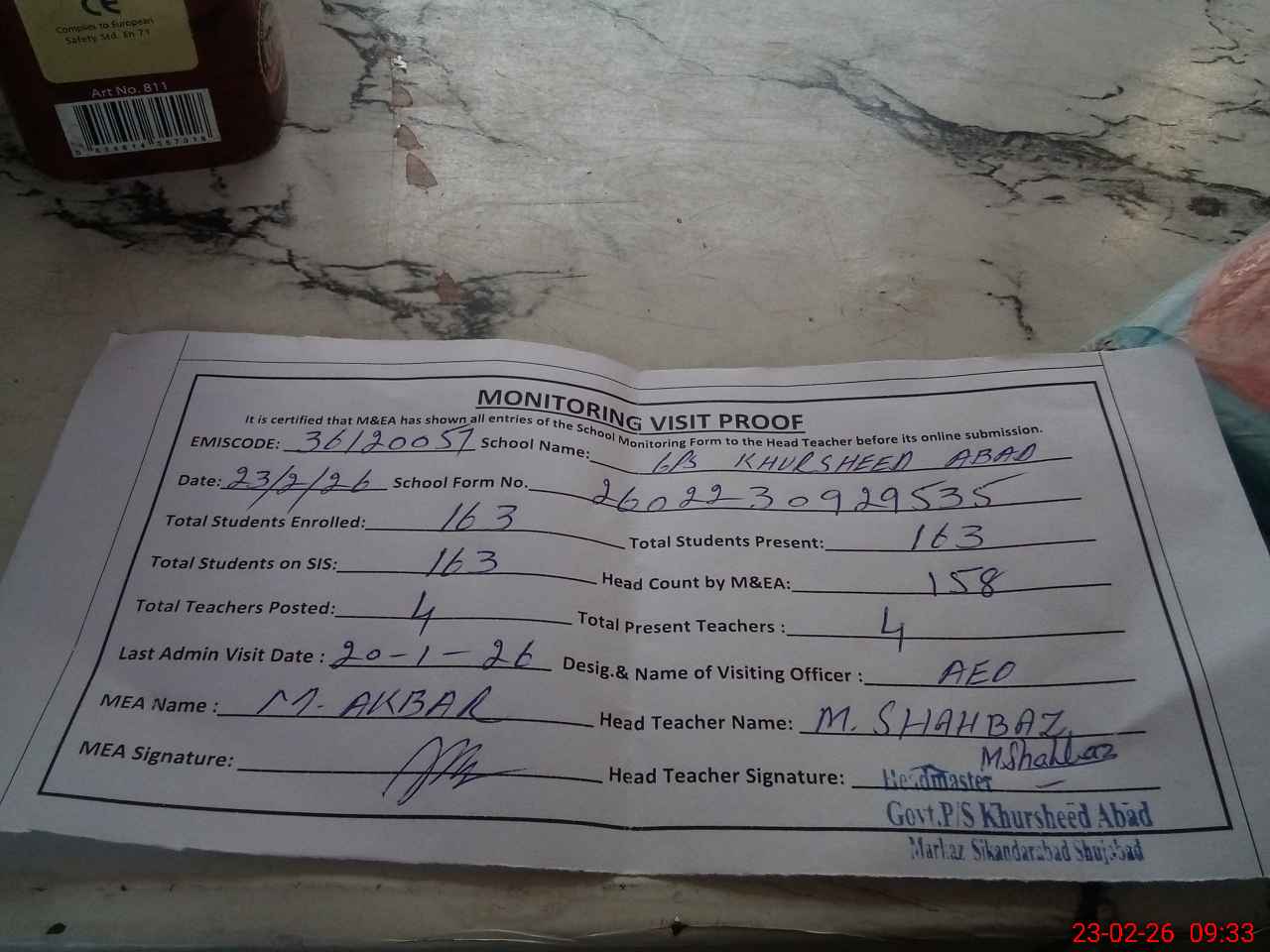 | Attendance Register | Head Teacher | MEA with School | Visit Proof |