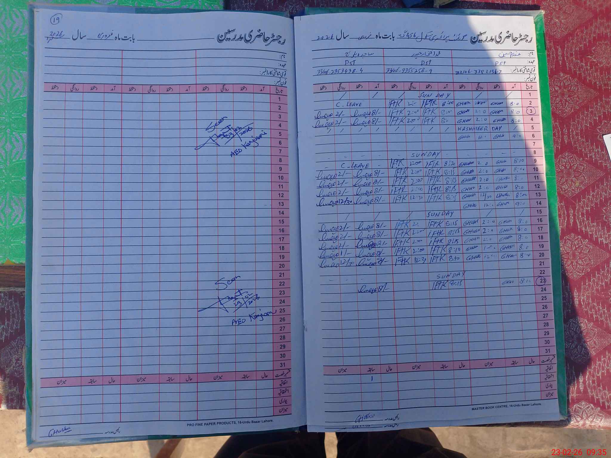 | CNIC | Full Name | Designation | R/C | Absence During Last Calender Month |