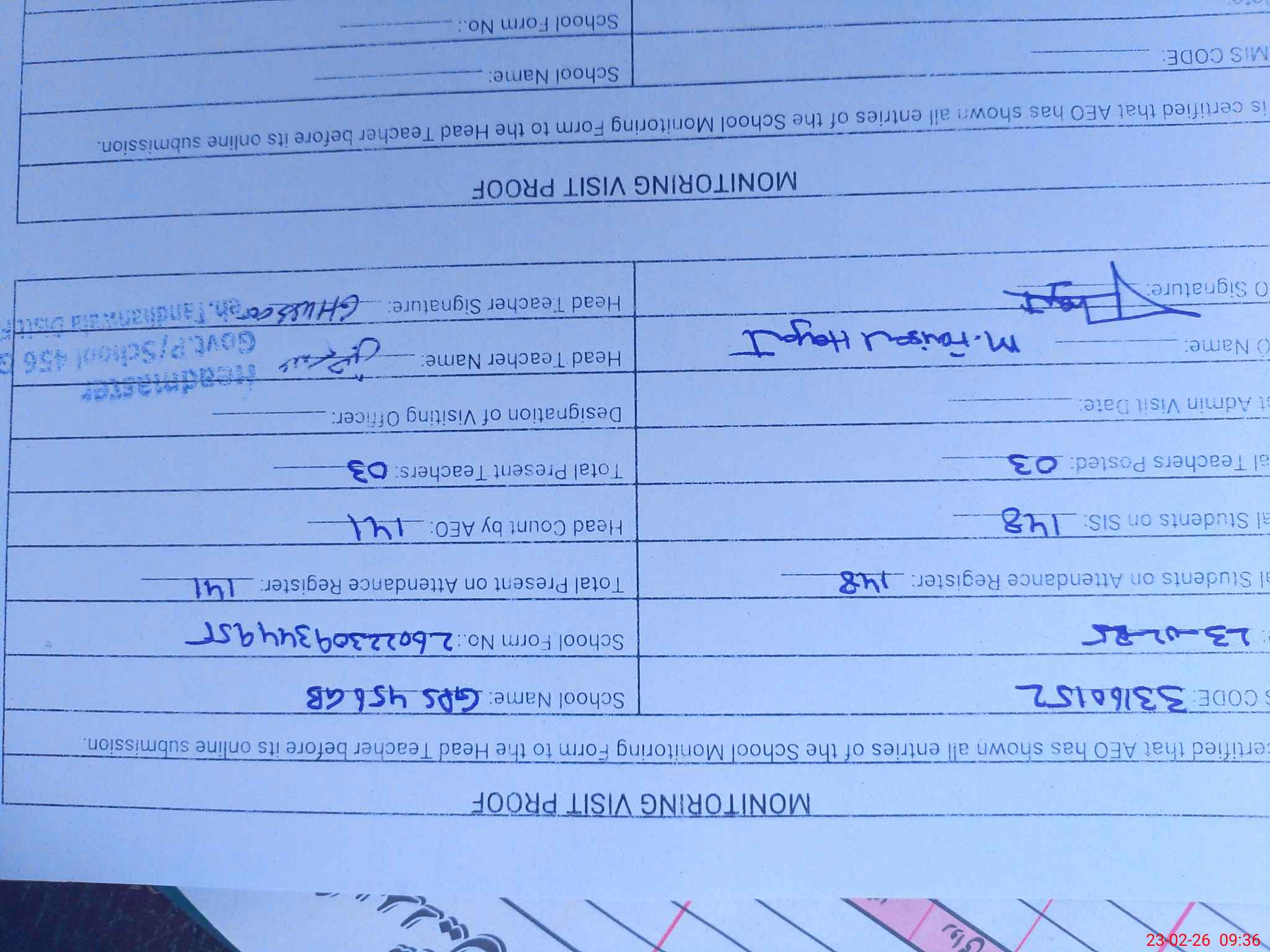 | Attendance Register | Head Teacher | MEA with School | Visit Proof |
