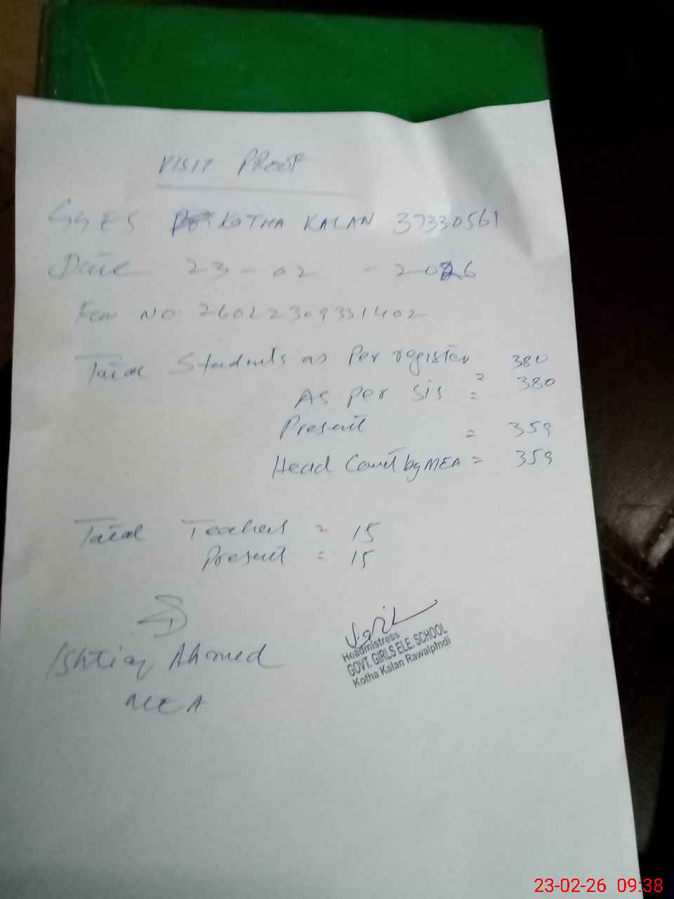 | Attendance Register | Head Teacher | MEA with School | Visit Proof |