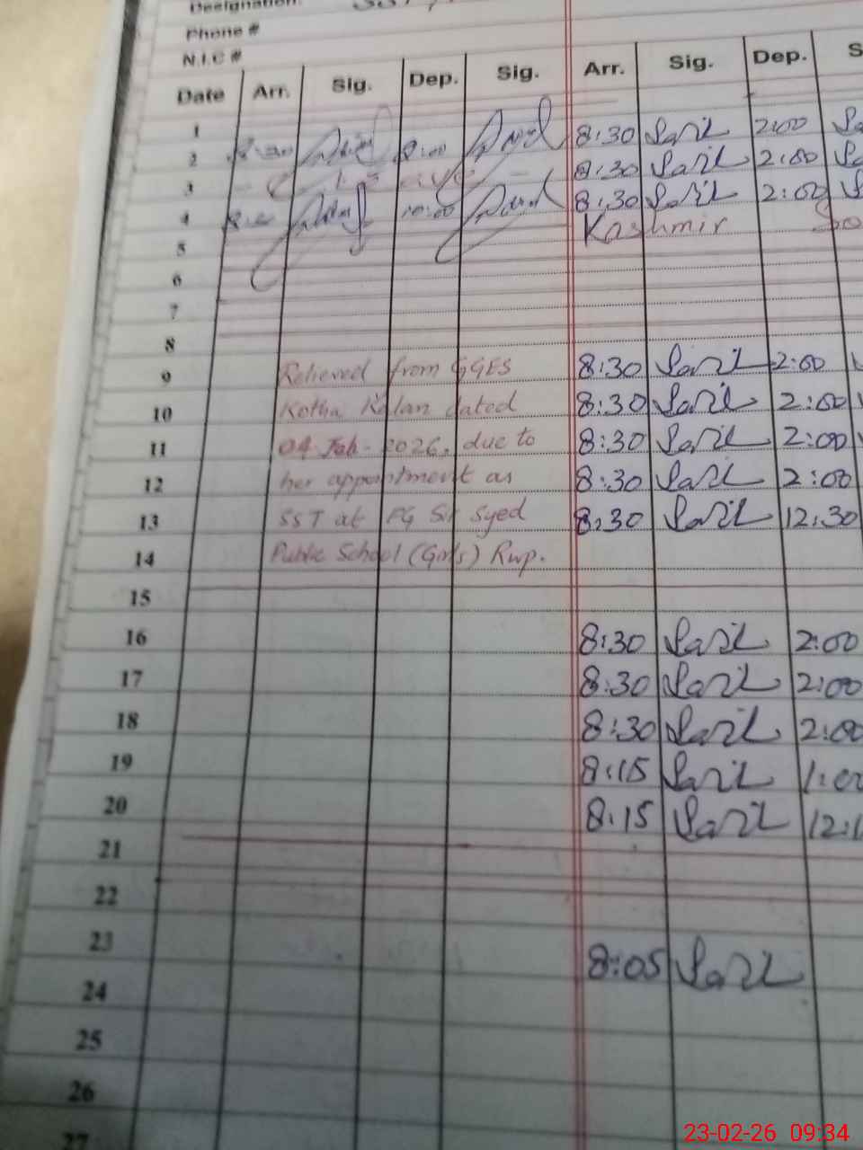 | Name: NA**** SH**** Designation: (School Headmaster's/Headmistress's) S.S.T.(G) Phone/Cell Number: 03**** |