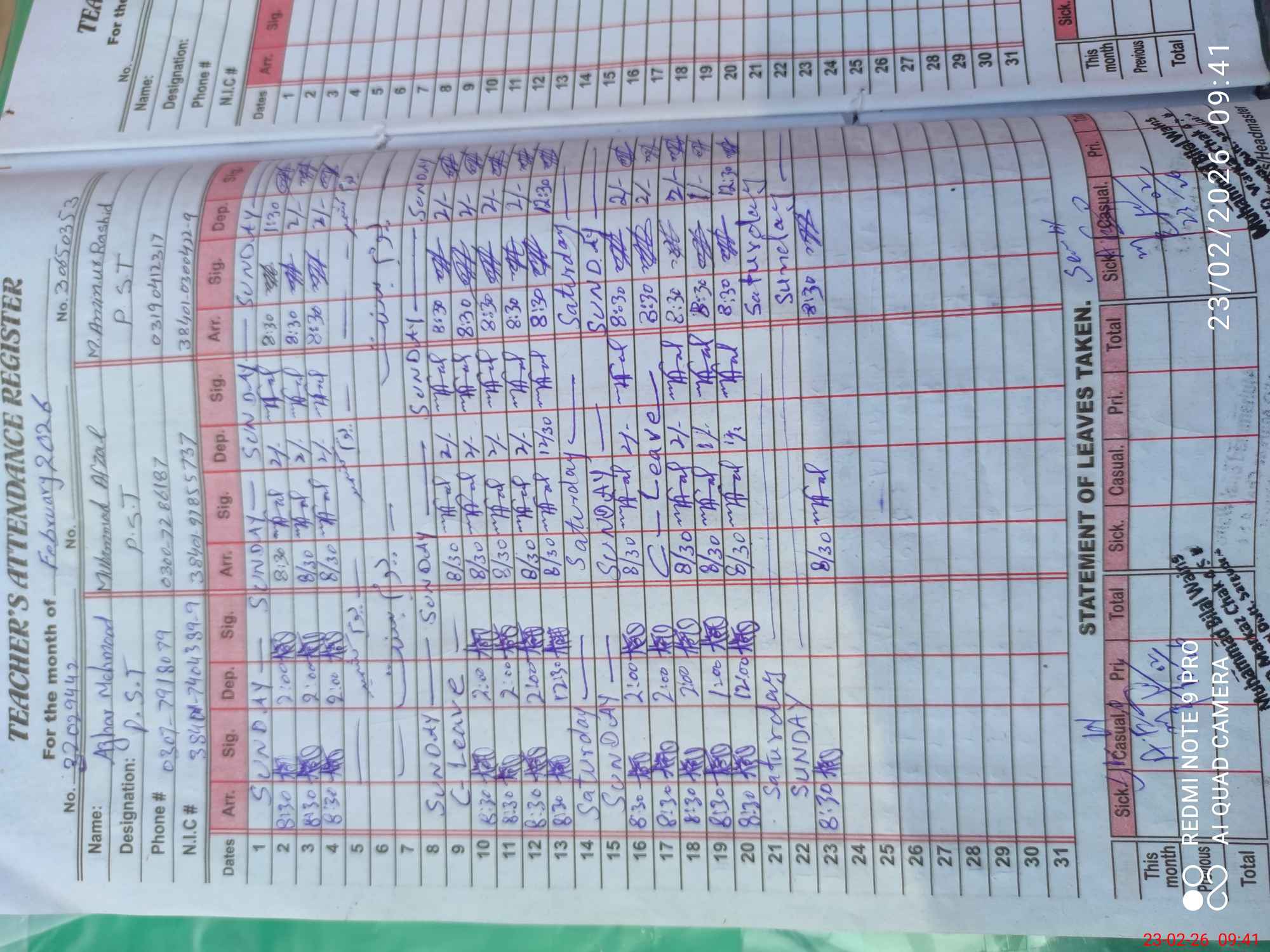 | Name: Az**** Me**** Designation: (School Headmaster's/Headmistress's) PST Phone/Cell Number: 03**** |