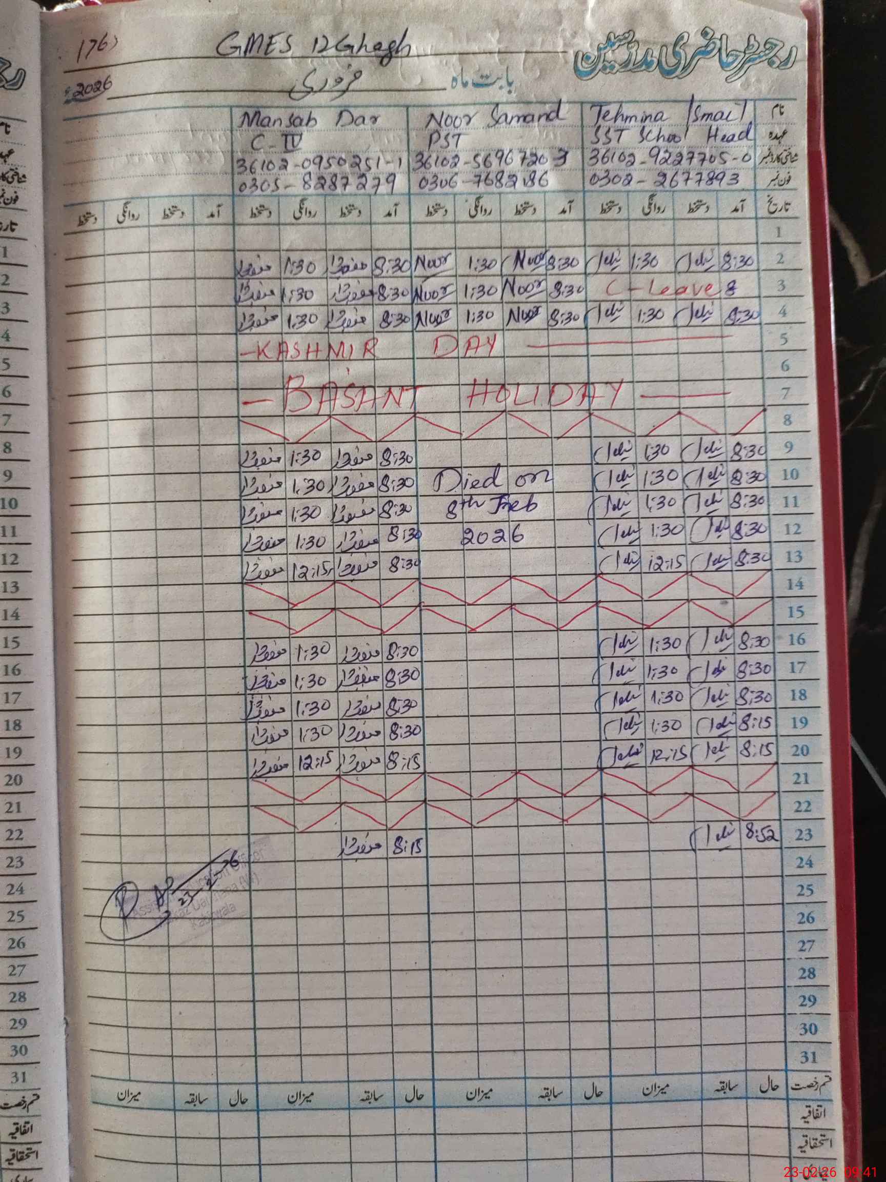 | CNIC | Full Name | Designation | R/C | Absence During Last Calender Month |