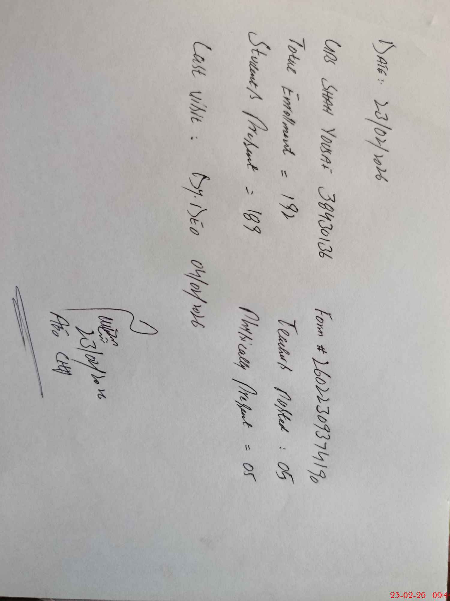 | Attendance Register | Head Teacher | MEA with School | Visit Proof |