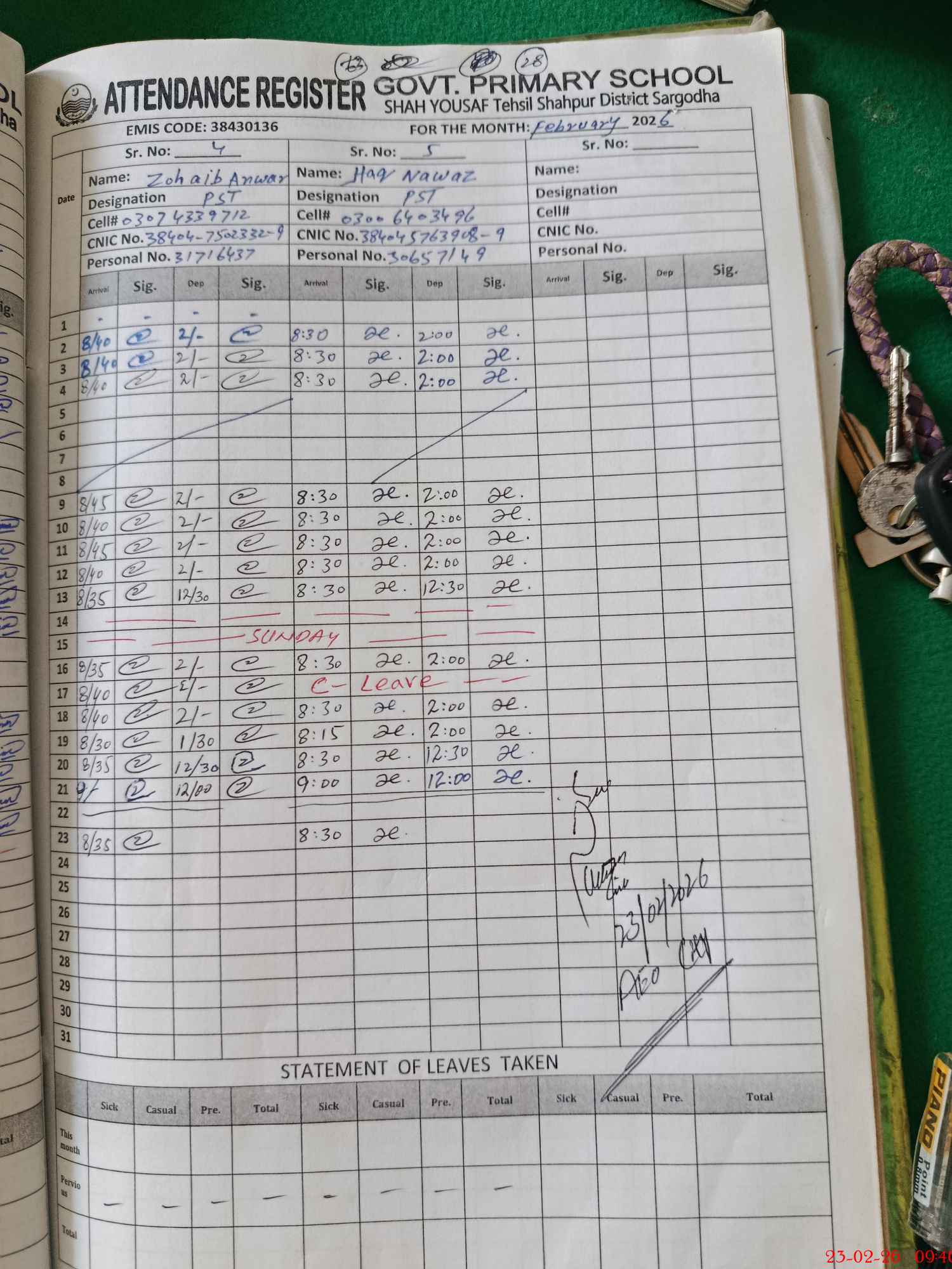 | Name: SA**** URRE**** Designation: (School Headmaster's/Headmistress's) PST Phone/Cell Number: 03**** |