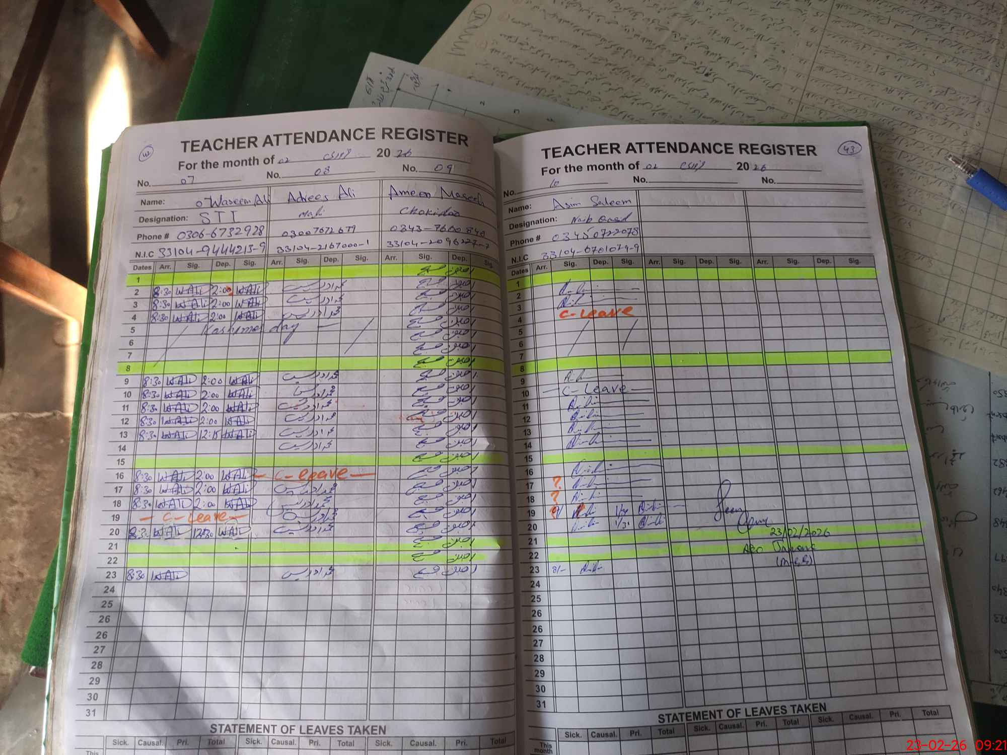 | CNIC | Full Name | Designation | R/C | Absence during last cal. month |