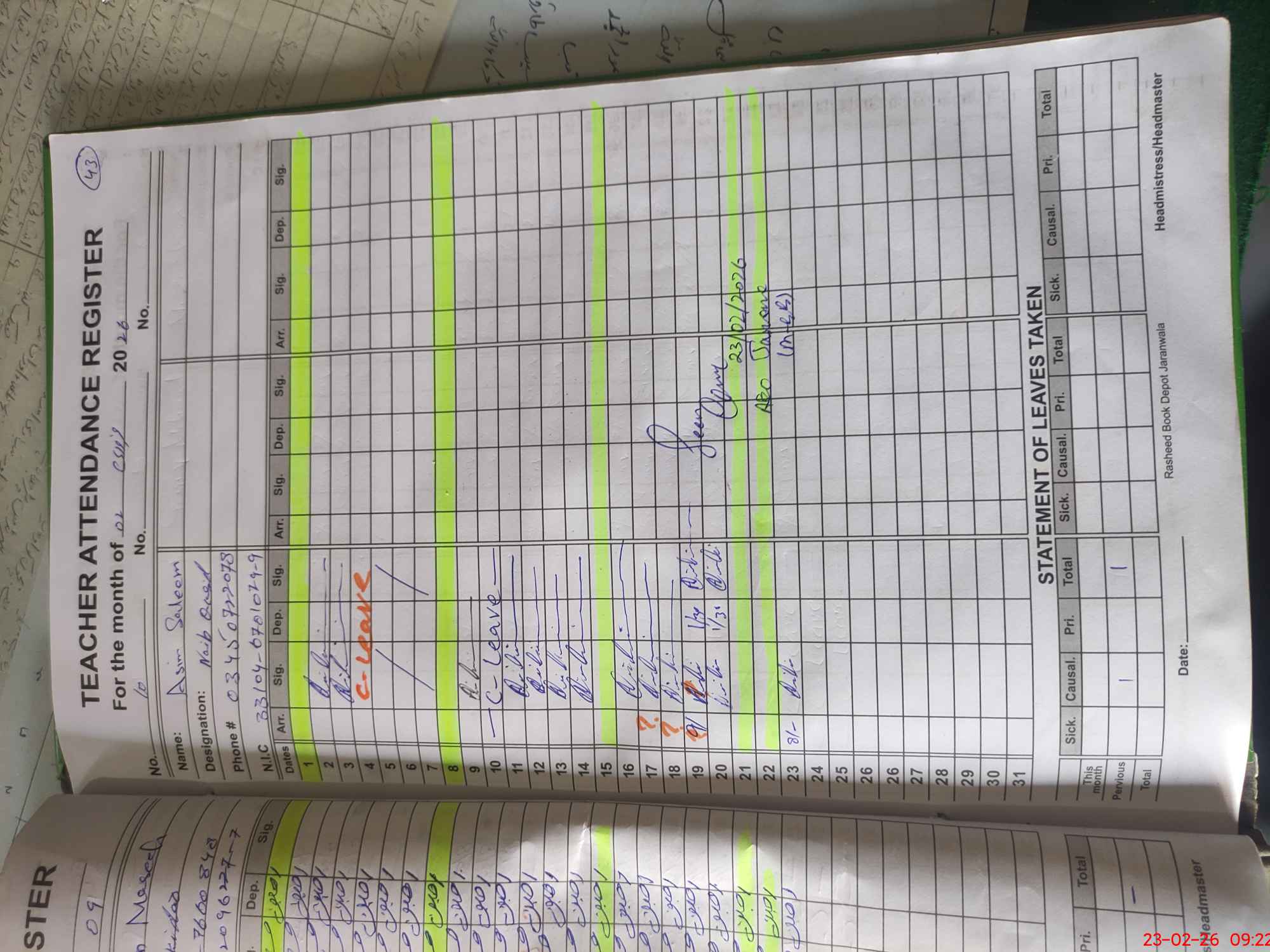 | CNIC | Full Name | Designation | R/C | Absence During Last Calender Month |