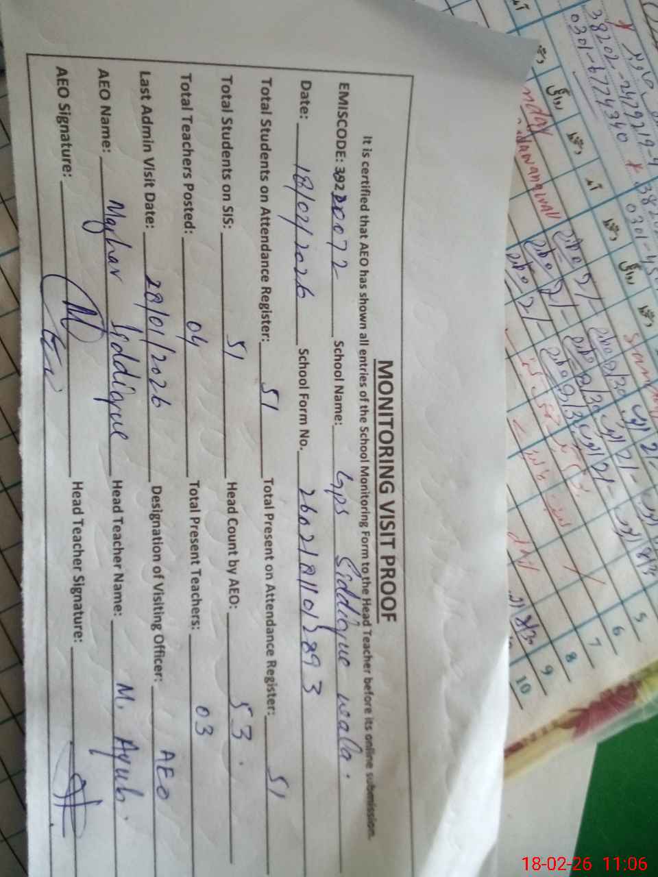 | EMIS Code: 38220072 | Name of School: GPS SIDDIQUE WALA | |||