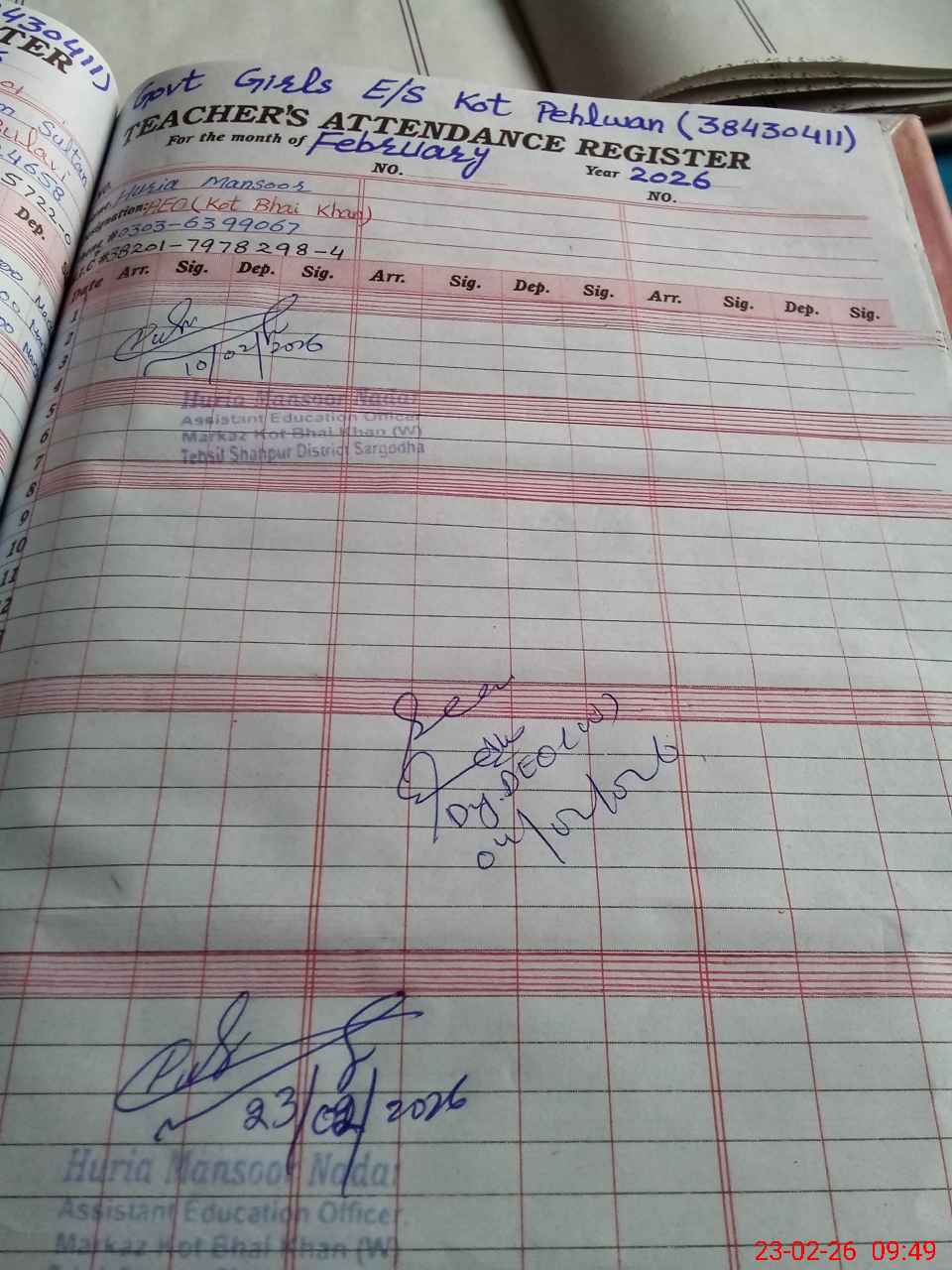 | Certified that this School was Inspected by the Undersigned MEA/DMO Today and the Information Stated Above is as Per Record. | |||||