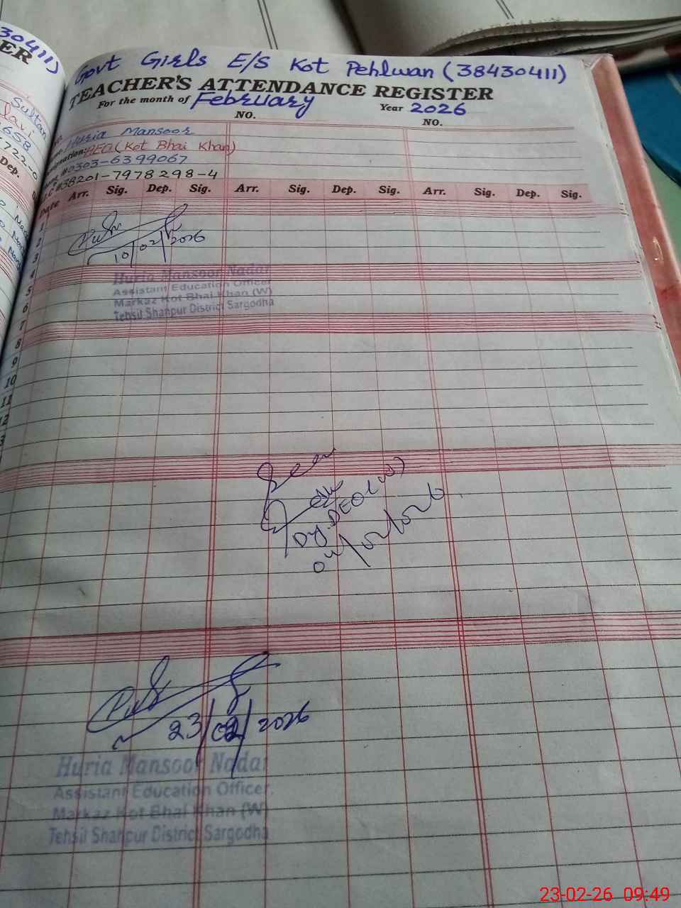 | Name: NA**** YA**** Designation: (School Headmaster's/Headmistress's) SSE(ARTS) Phone/Cell Number: 03**** |