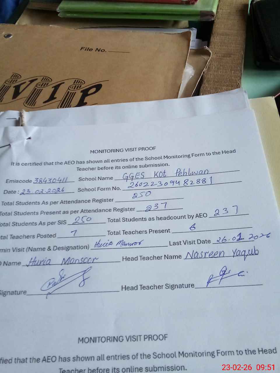 | Attendance Register | Head Teacher | MEA with School | Visit Proof |