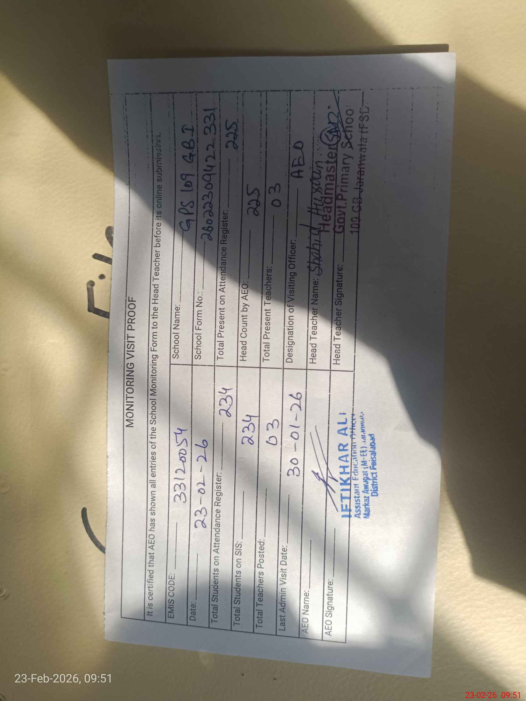 | Certified that this School was Inspected by the Undersigned MEA/DMO Today and the Information Stated Above is as Per Record. | |||||