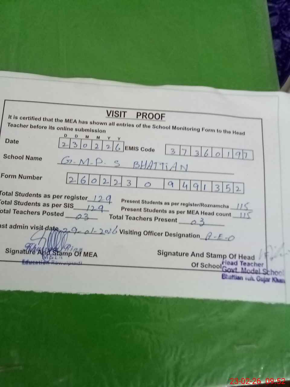 | Certified that this School was Inspected by the Undersigned MEA/DMO Today and the Information Stated Above is as Per Record. | |||||