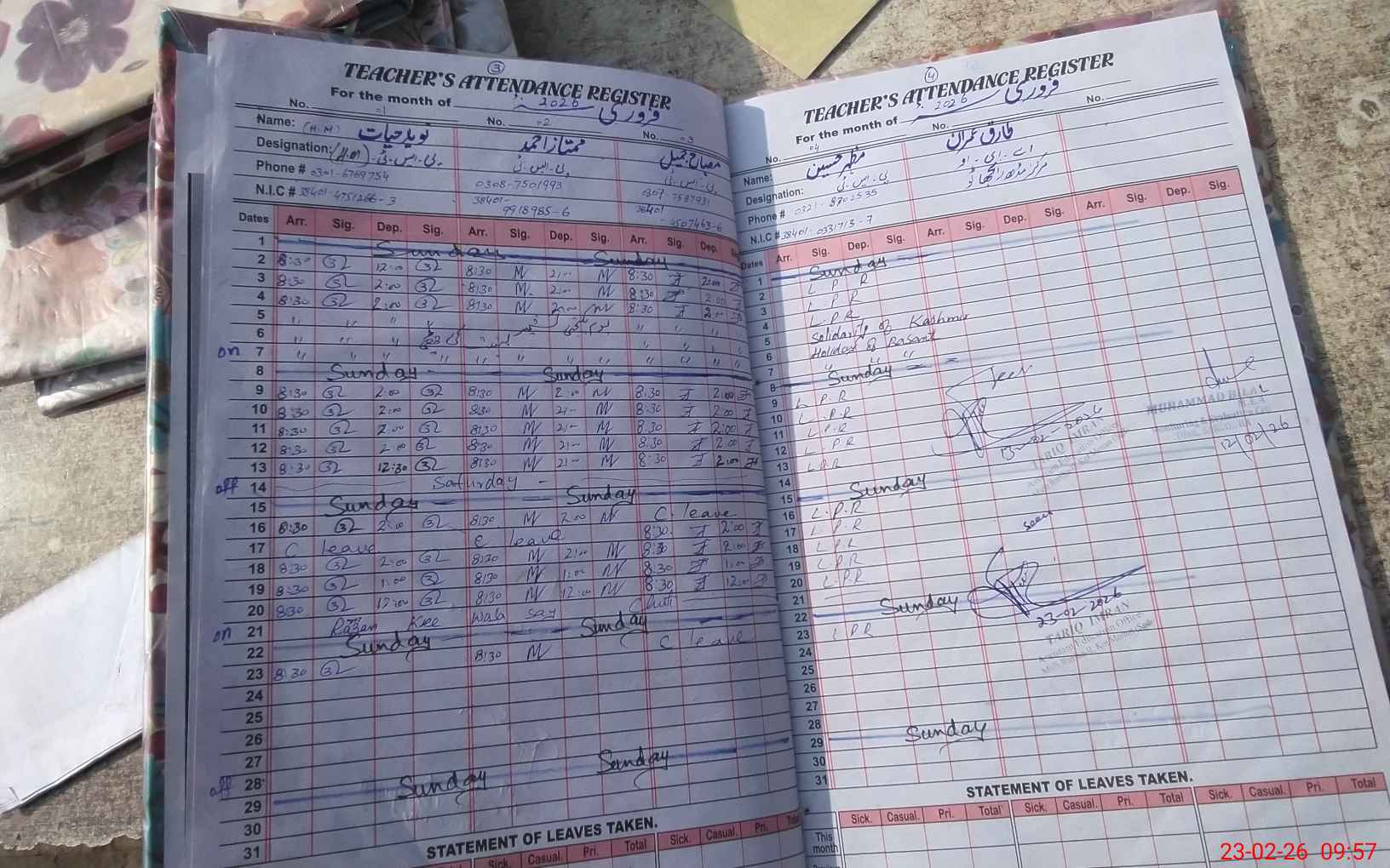 | CNIC | Full Name | Designation | R/C | Absence During Last Calender Month |