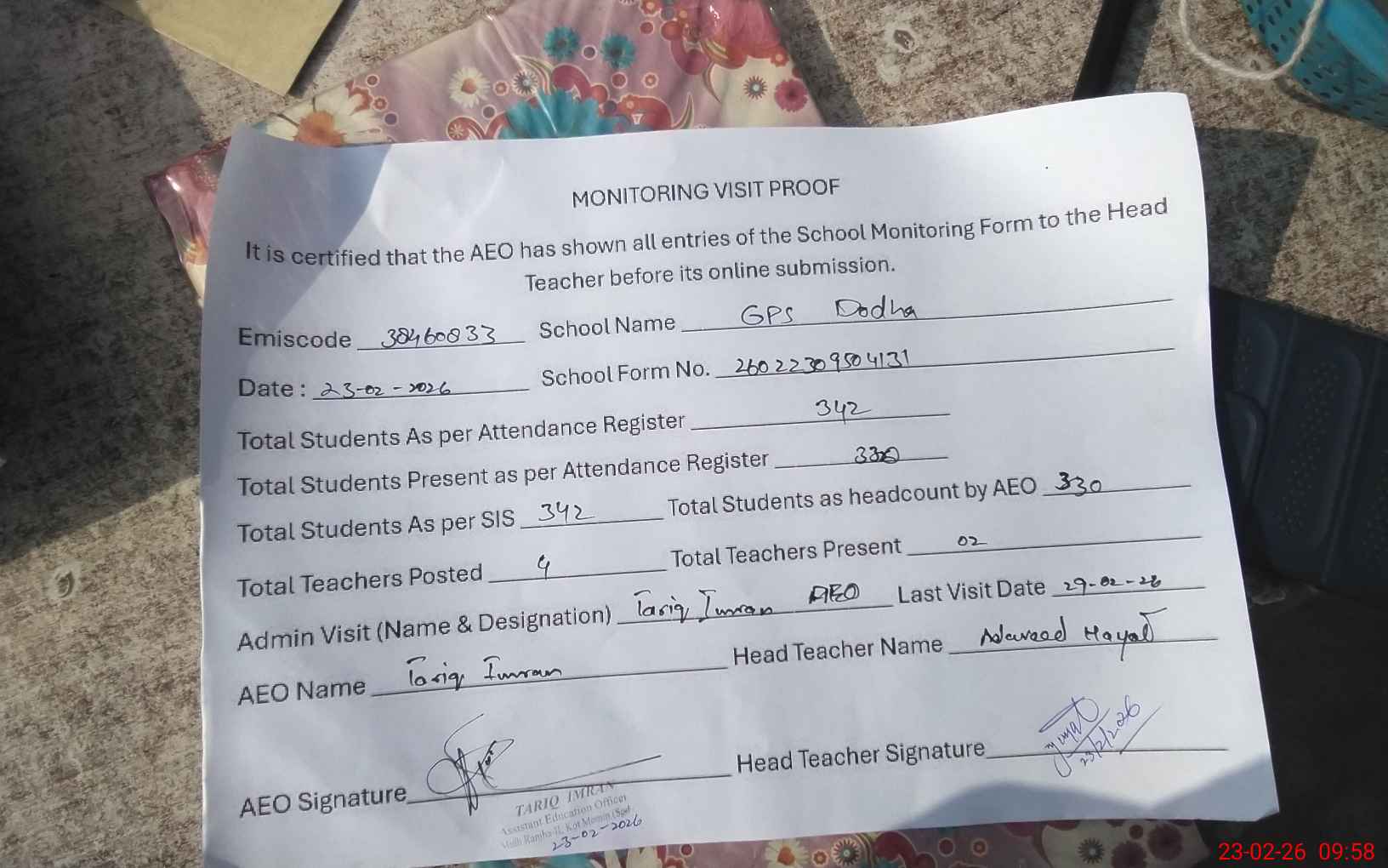 | Attendance Register | Head Teacher | MEA with School | Visit Proof |