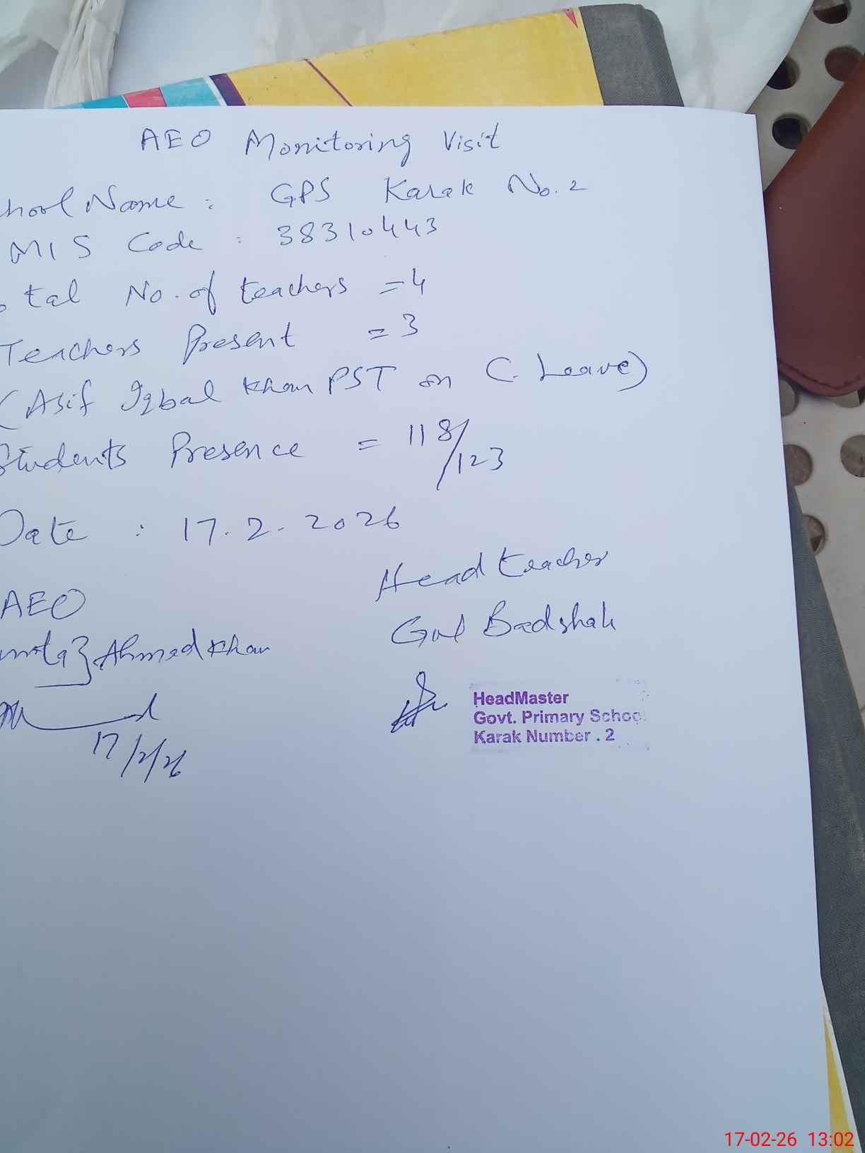 | EMIS Code: 38310443 | Name of School: GPS KARAK NO.2 | |||