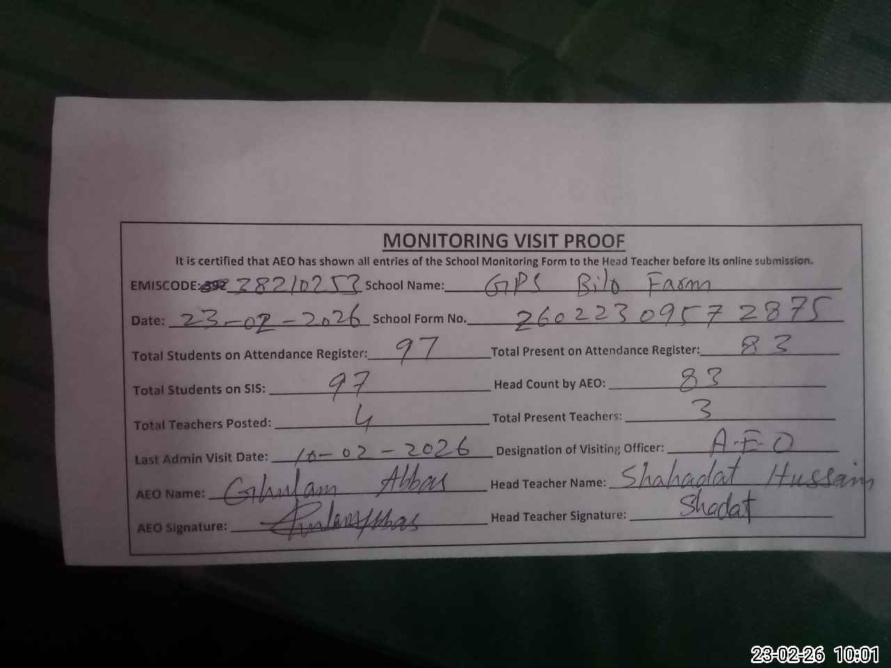 | Attendance Register | Head Teacher | MEA with School | Visit Proof |