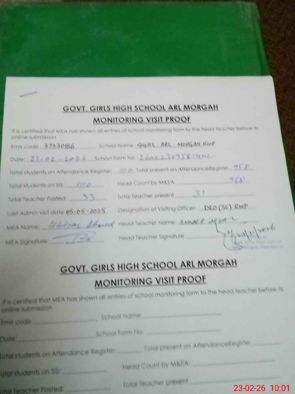 | Attendance Register | Head Teacher | MEA with School | Visit Proof |
