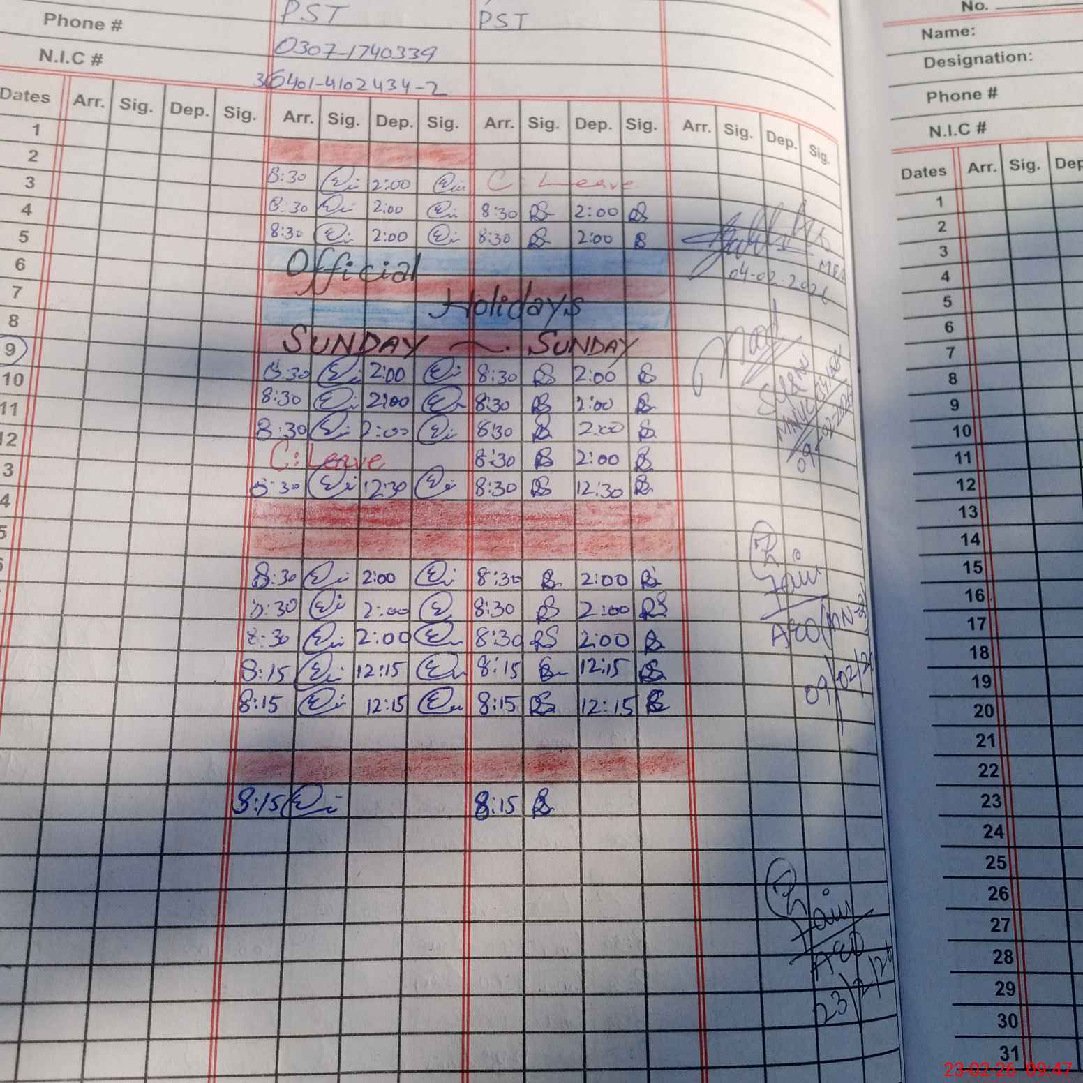 | CNIC | Full Name | Designation | R/C | Absence During Last Calender Month |