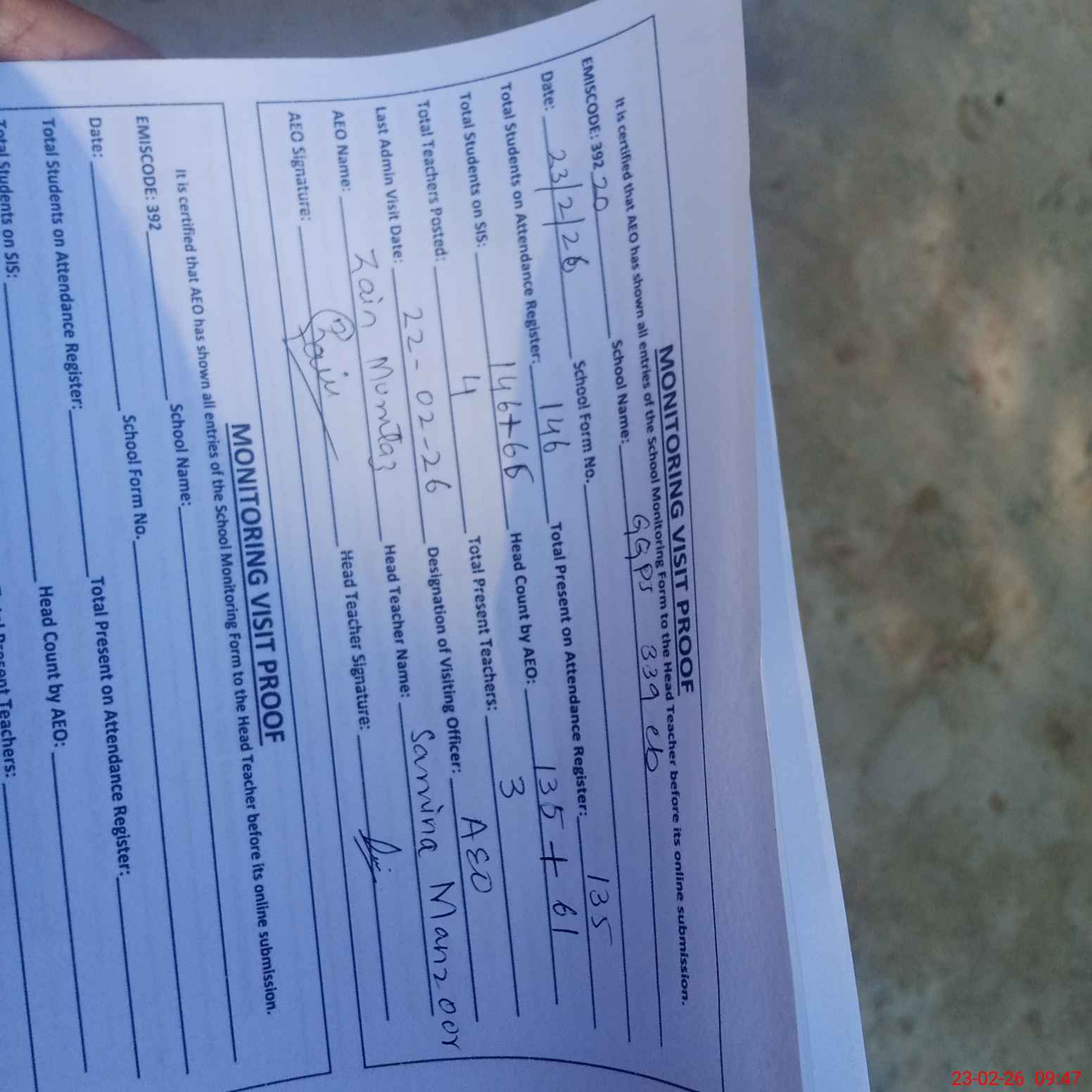 | Attendance Register | Head Teacher | MEA with School | Visit Proof |