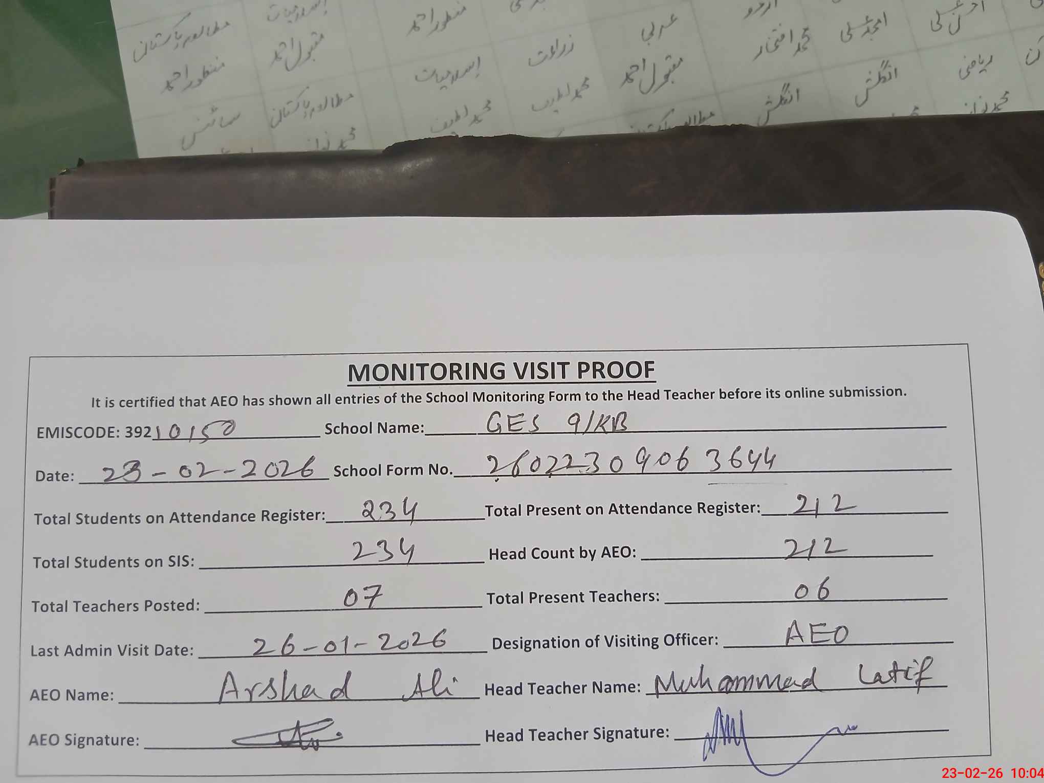 | Attendance Register | Head Teacher | MEA with School | Visit Proof |