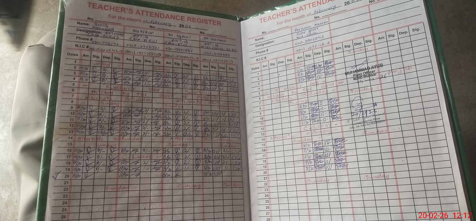 | CNIC | Full Name | Designation | R/C | Absence during last cal. month |