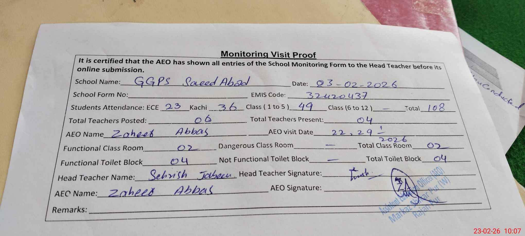 | EMIS Code: 32420437 | Name of School: GGPS SAEED ABAD | |||