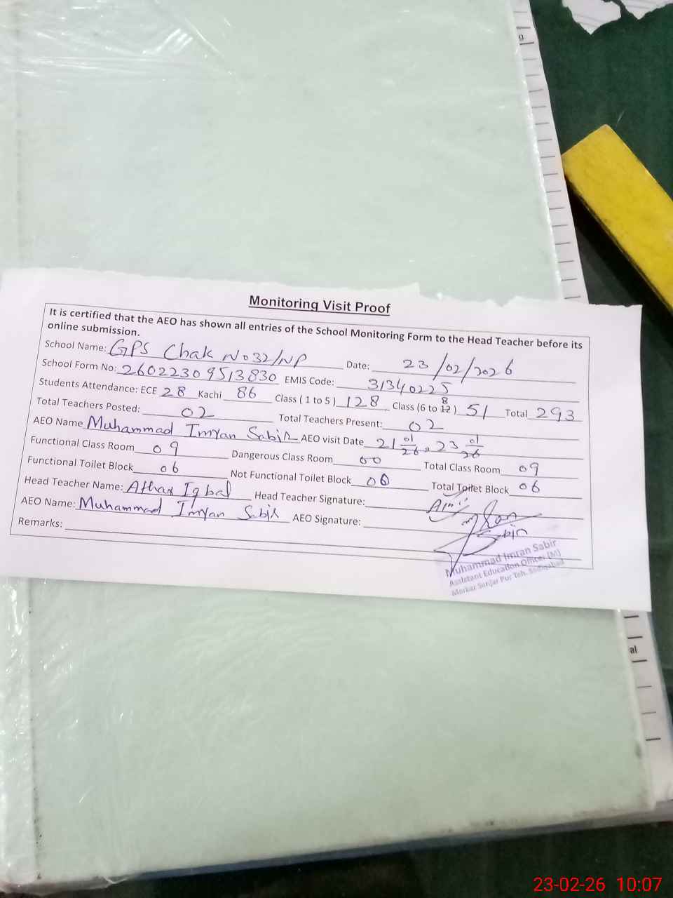 | Monitoring Date: 23-02-2026 | Start Time: 23-02-2026 09:25 AM | End Time: 23-02-2026 10:08 AM | Name of MEA: Mu**** Im**** Sa**** | |