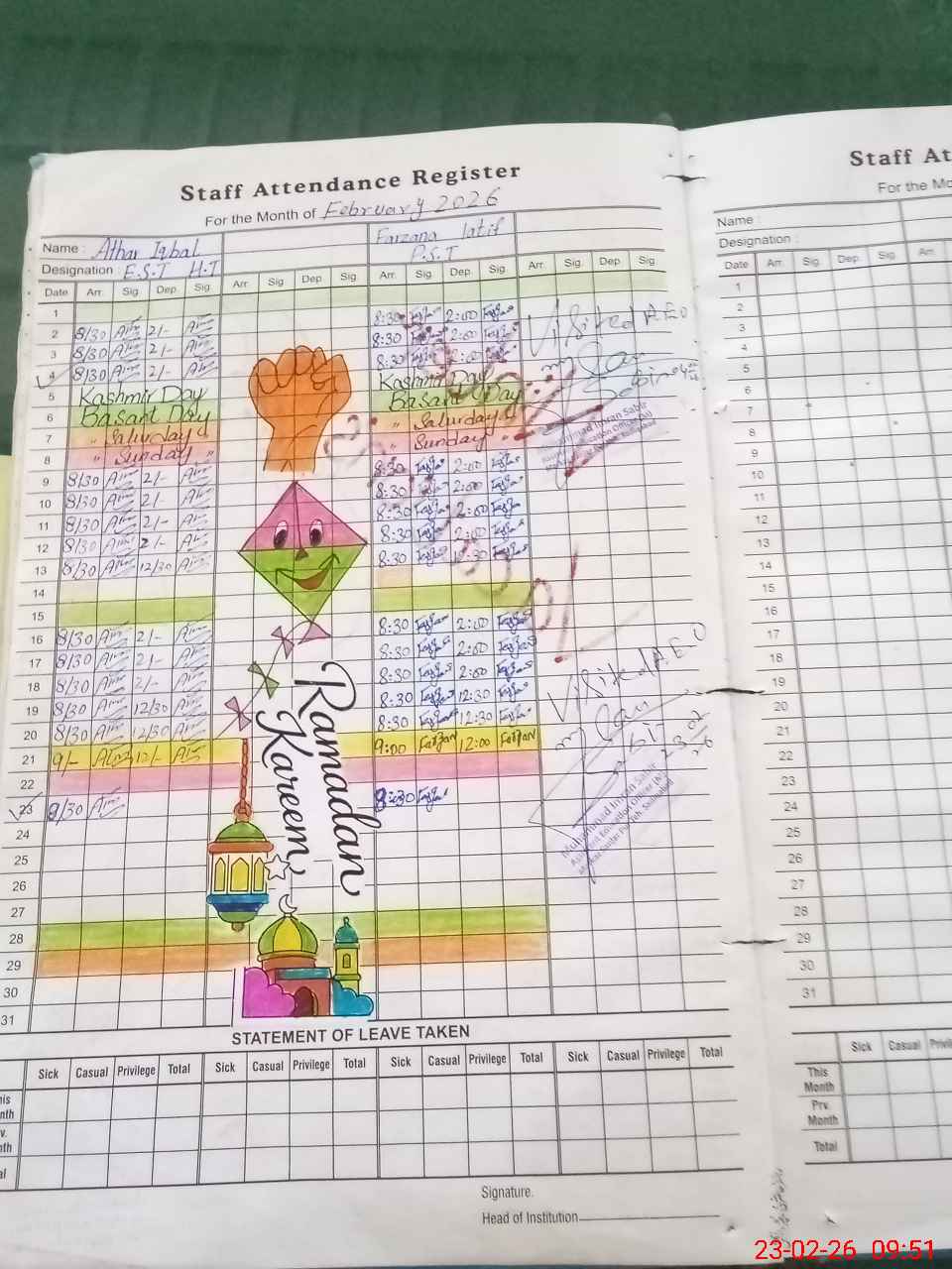 | Attendance Register | Head Teacher | MEA with School | Visit Proof |