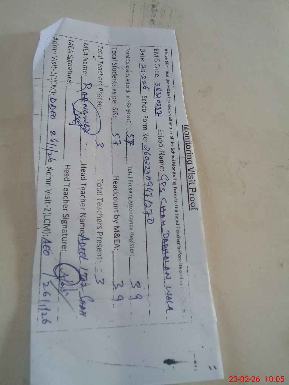 | Attendance Register | Head Teacher | MEA with School | Visit Proof |