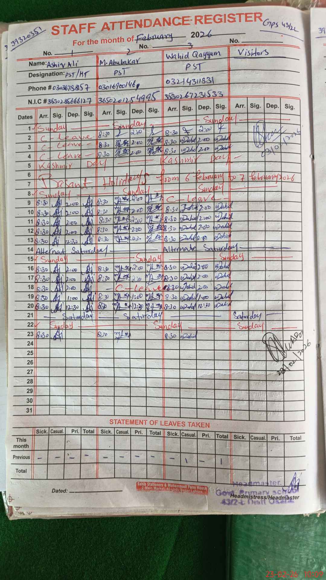 | Name: As**** Al**** Designation: (School Headmaster's/Headmistress's) PST Phone/Cell Number: 03**** |