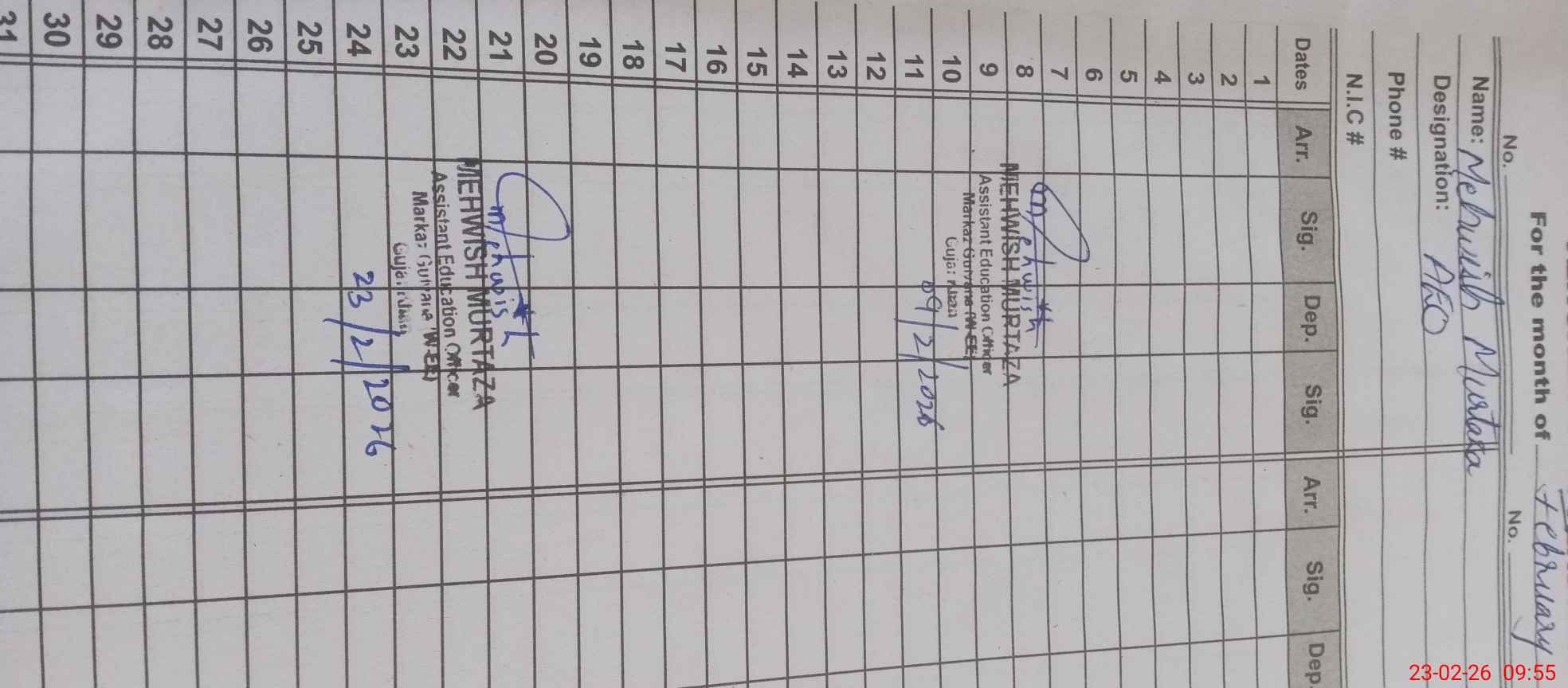 | CNIC | Full Name | Designation | R/C | Absence During Last Calender Month |