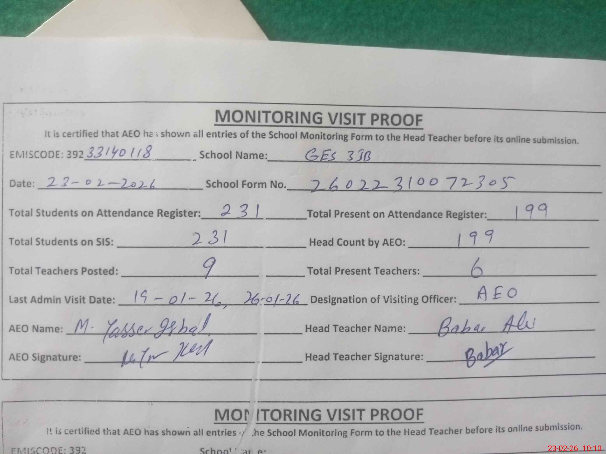 | Monitoring Date: 23-02-2026 | Start Time: 23-02-2026 09:17 AM | End Time: 23-02-2026 10:10 AM | Name of MEA: M.Ya**** Iq**** | |