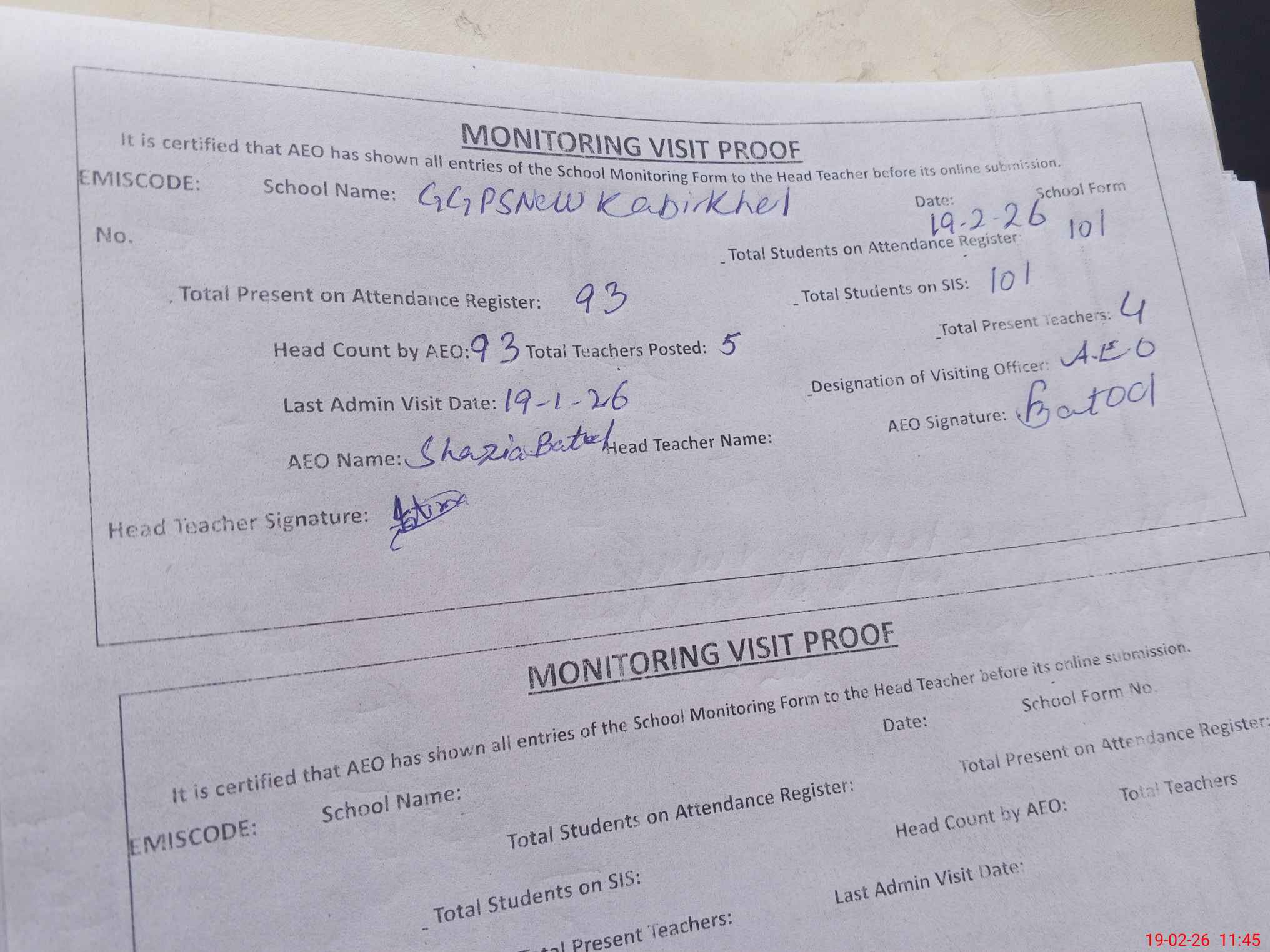 | Attendance Register | Head Teacher | MEA with School | Visit Proof |