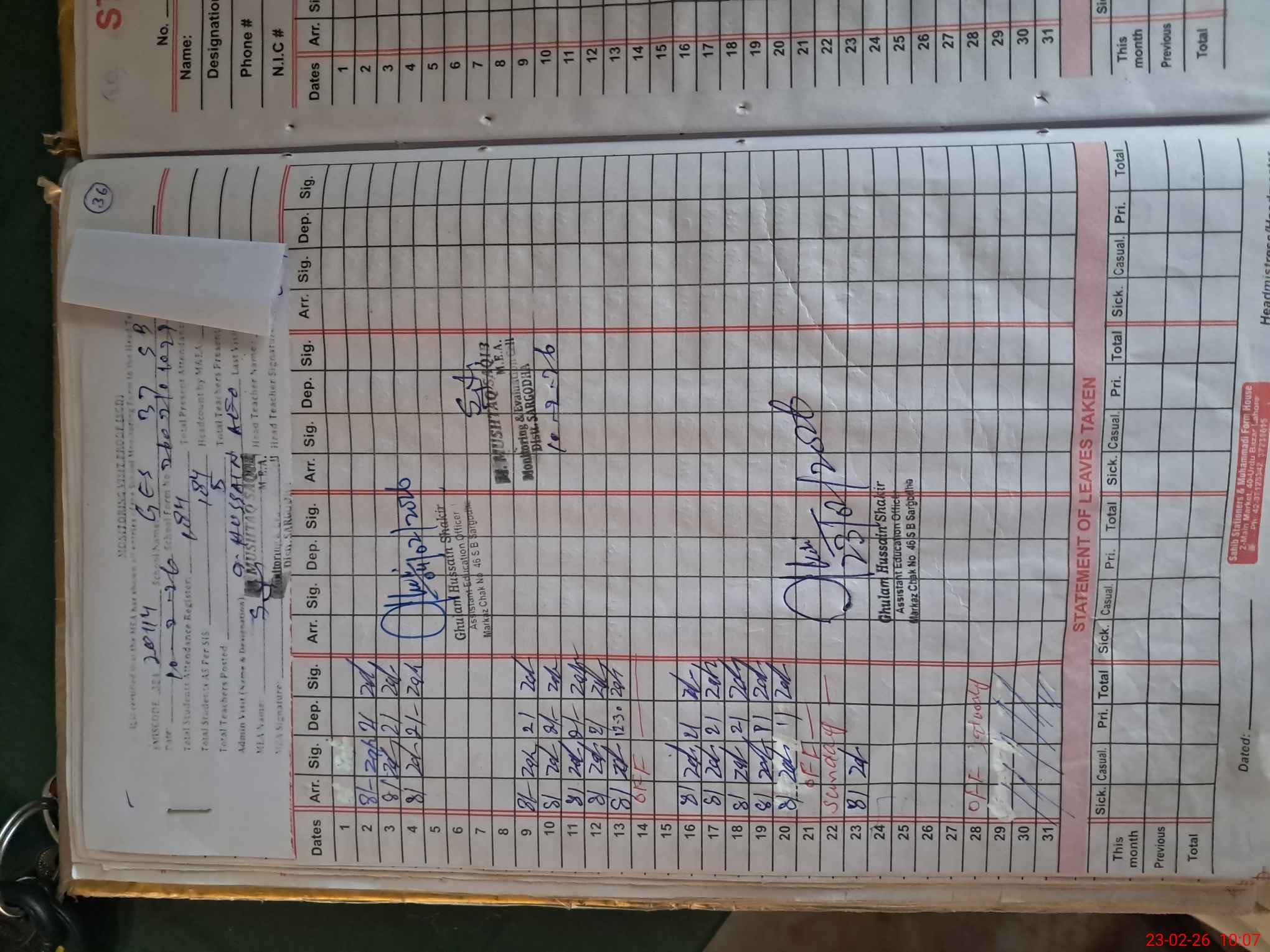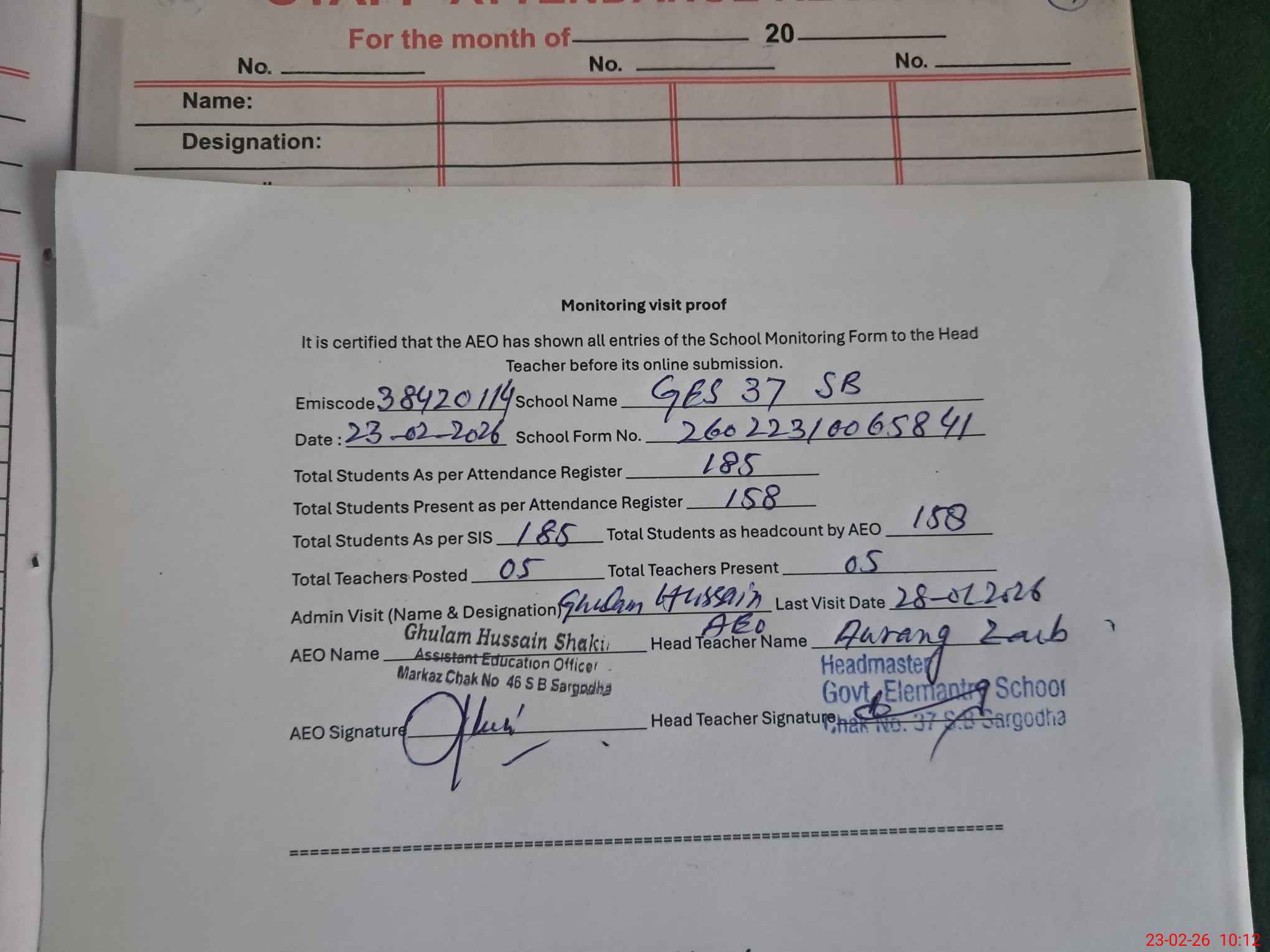 | Attendance Register | Head Teacher | MEA with School | Visit Proof |