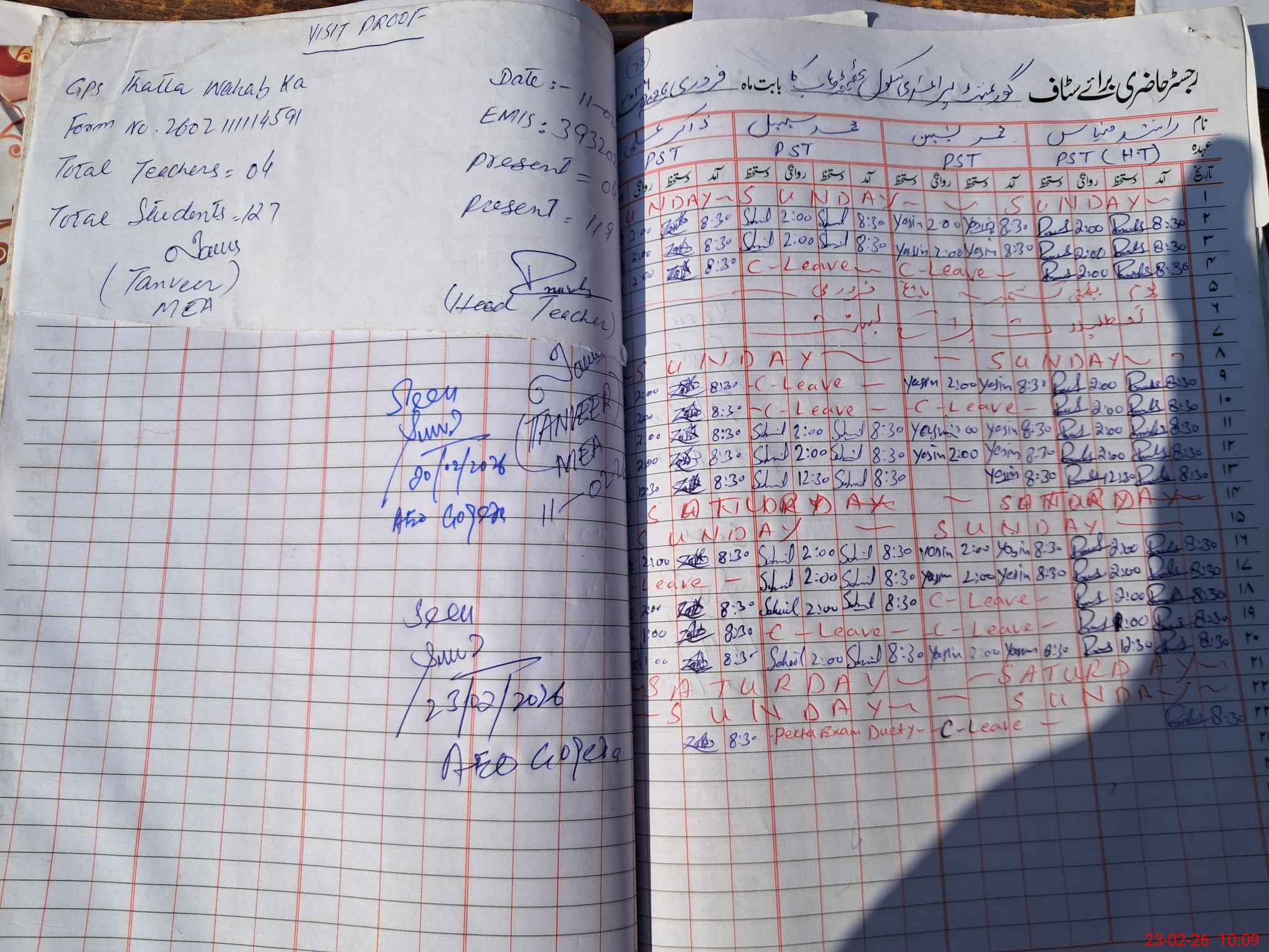 | Attendance Register | Head Teacher | MEA with School | Visit Proof |