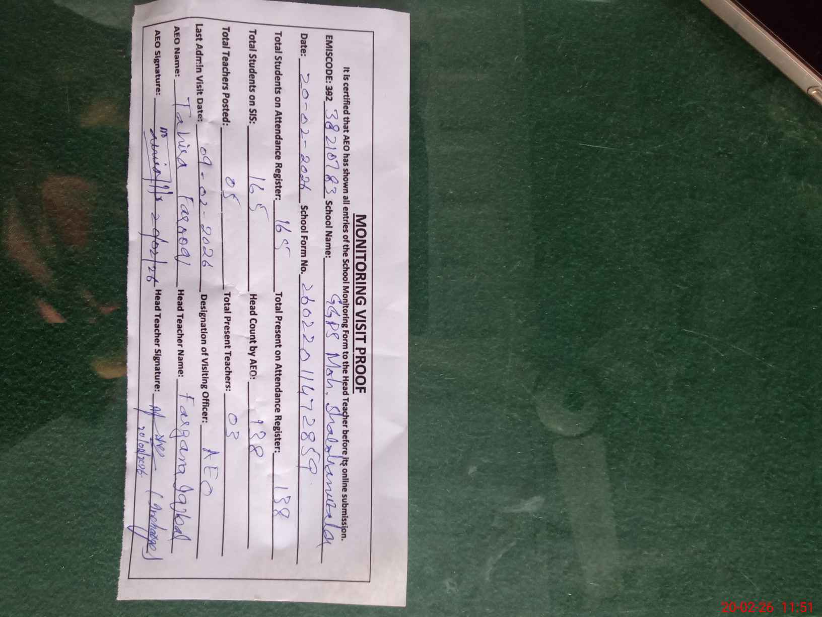 | Certified that this School was Inspected by the Undersigned MEA/DMO Today and the Information Stated Above is as Per Record. | |||||