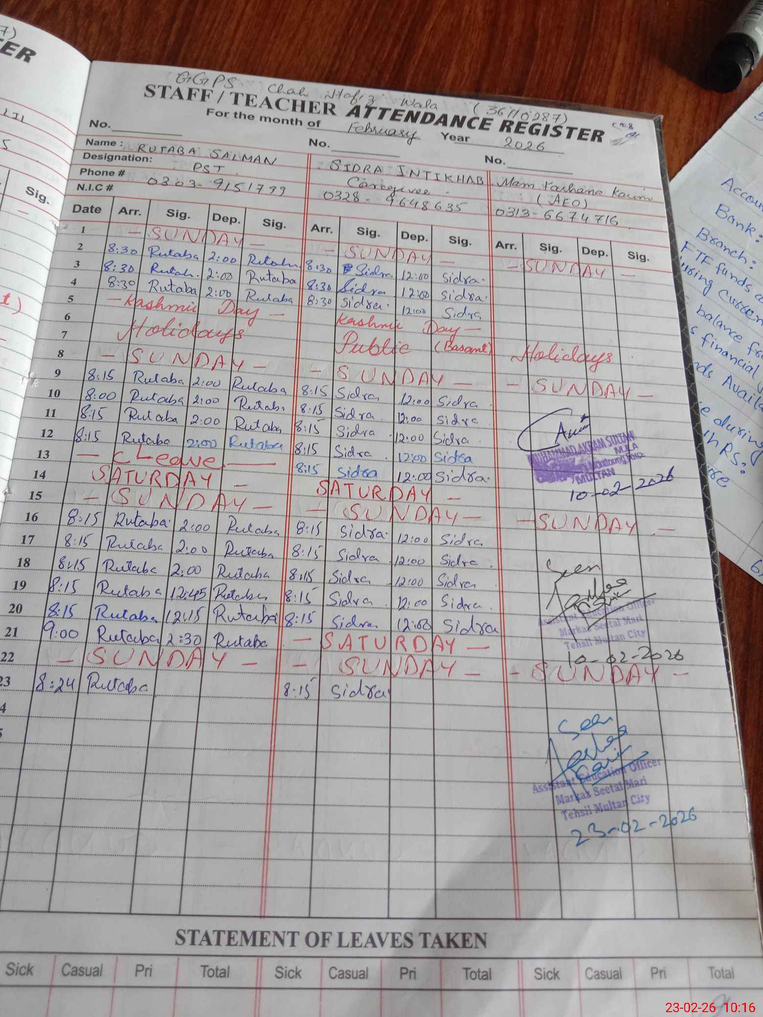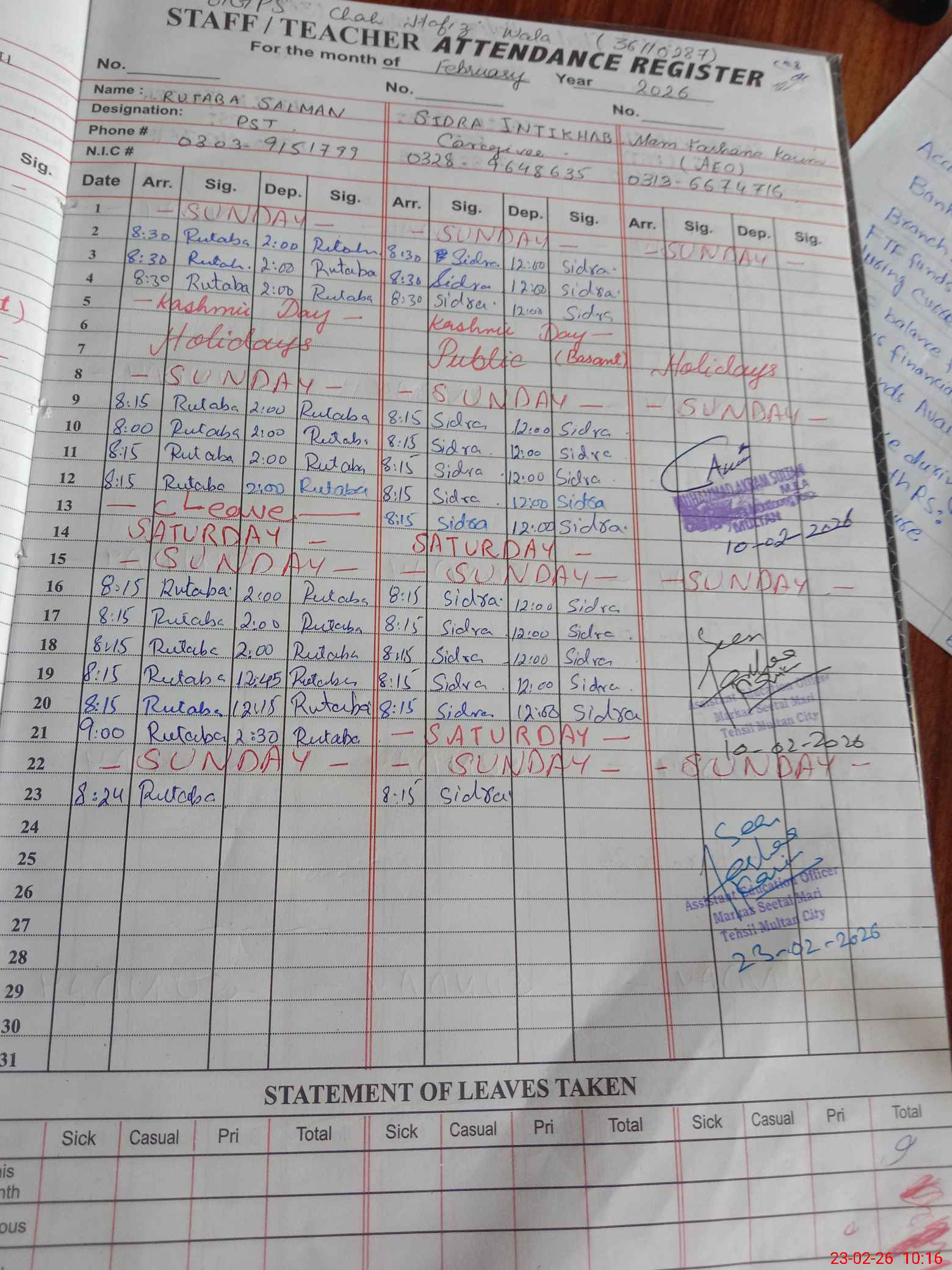 | 36**** | Sa**** Kh**** | PST Science/Maths | Regular | 0 | 0 | 0 | 0 | 0 | 0 | 0 | 0 | 0 | Maternity |