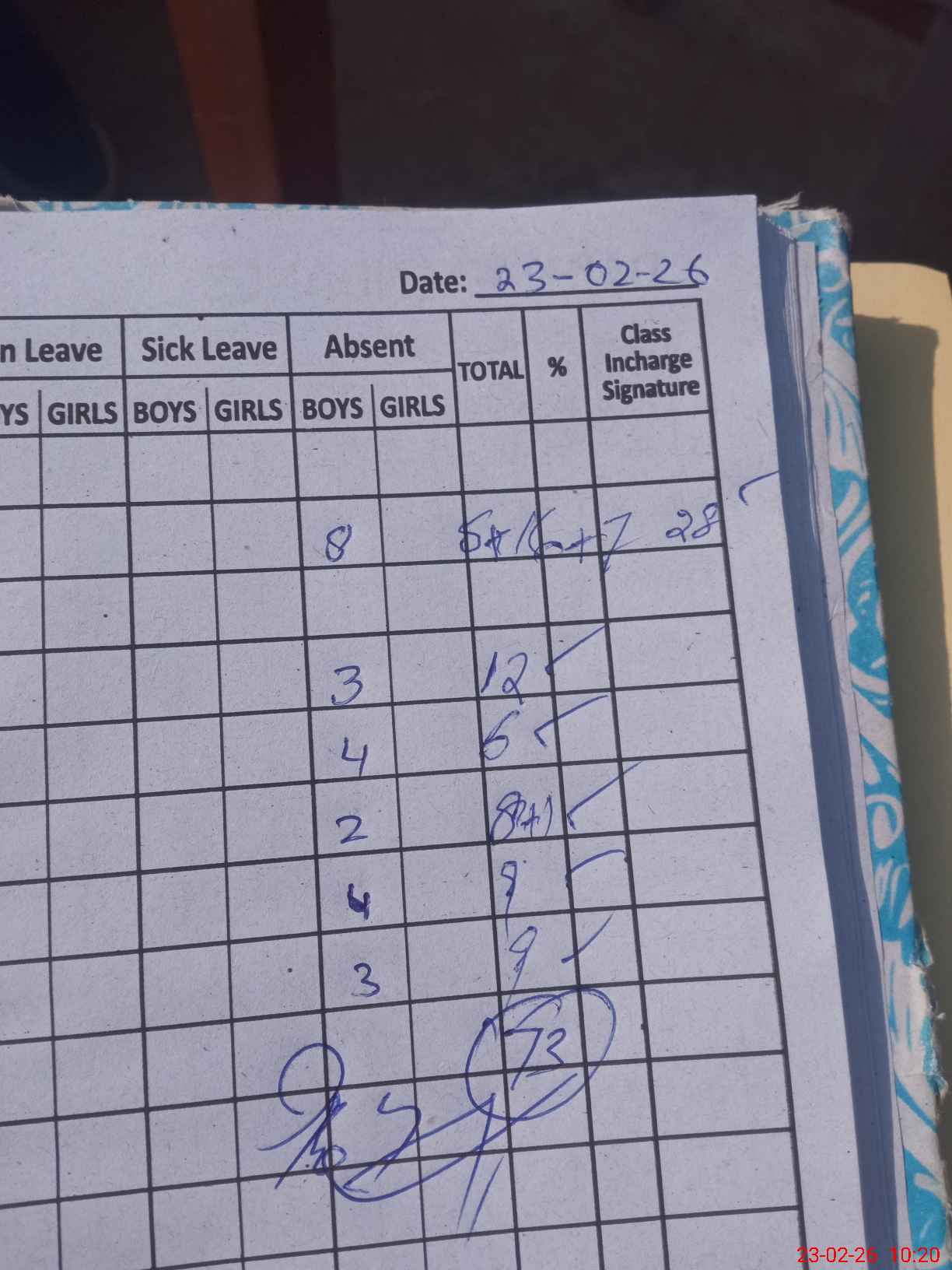 | Total Students Present | 0 | 0 | 12 | 6 | 9 | 9 | 9 | 73 | ||||||||