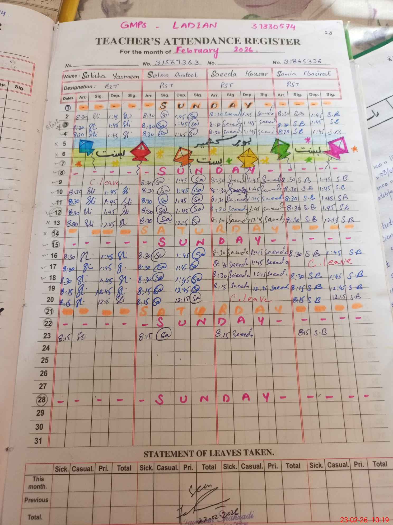 | Name: Sa**** Ba**** Designation: (School Headmaster's/Headmistress's) PST Phone/Cell Number: 03**** |