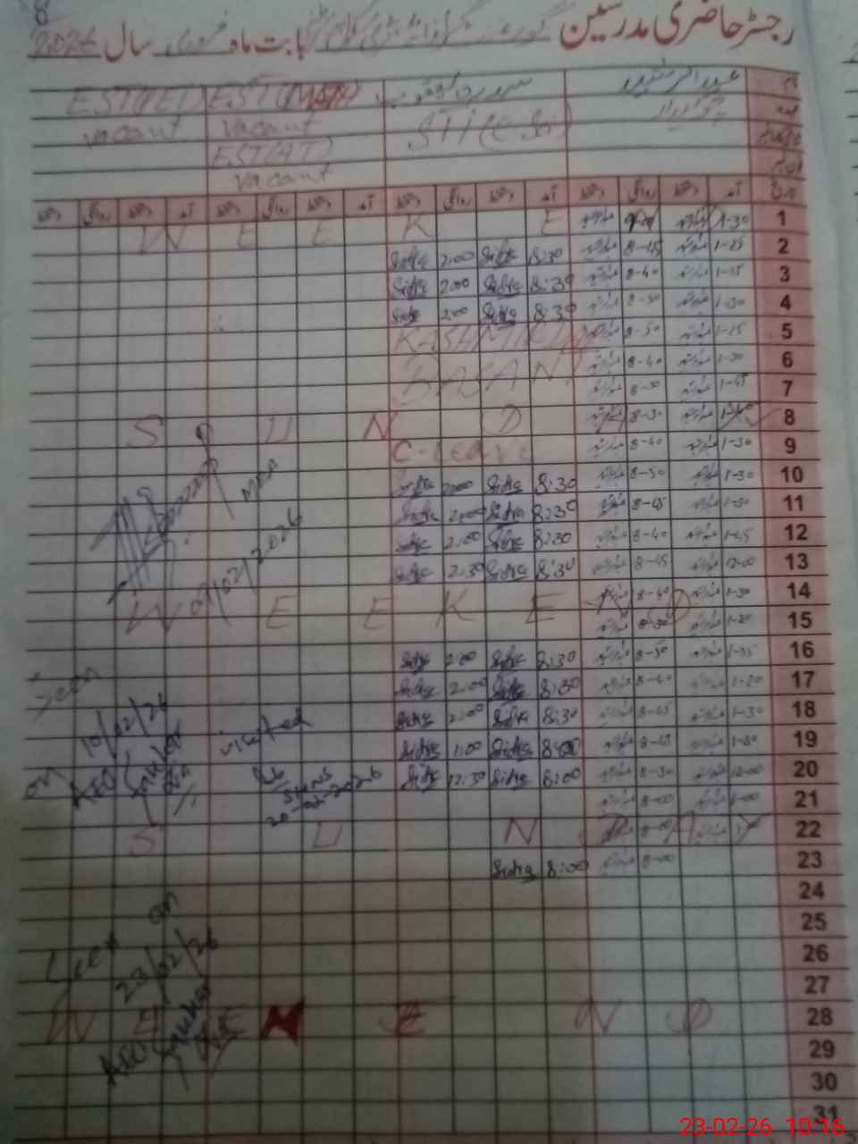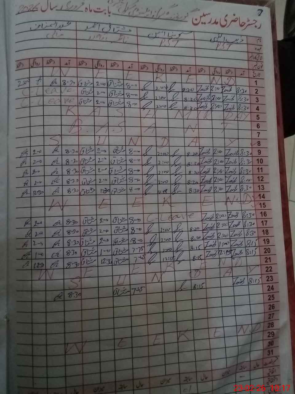 | CNIC | Full Name | Designation | R/C | Absence During Last Calender Month |