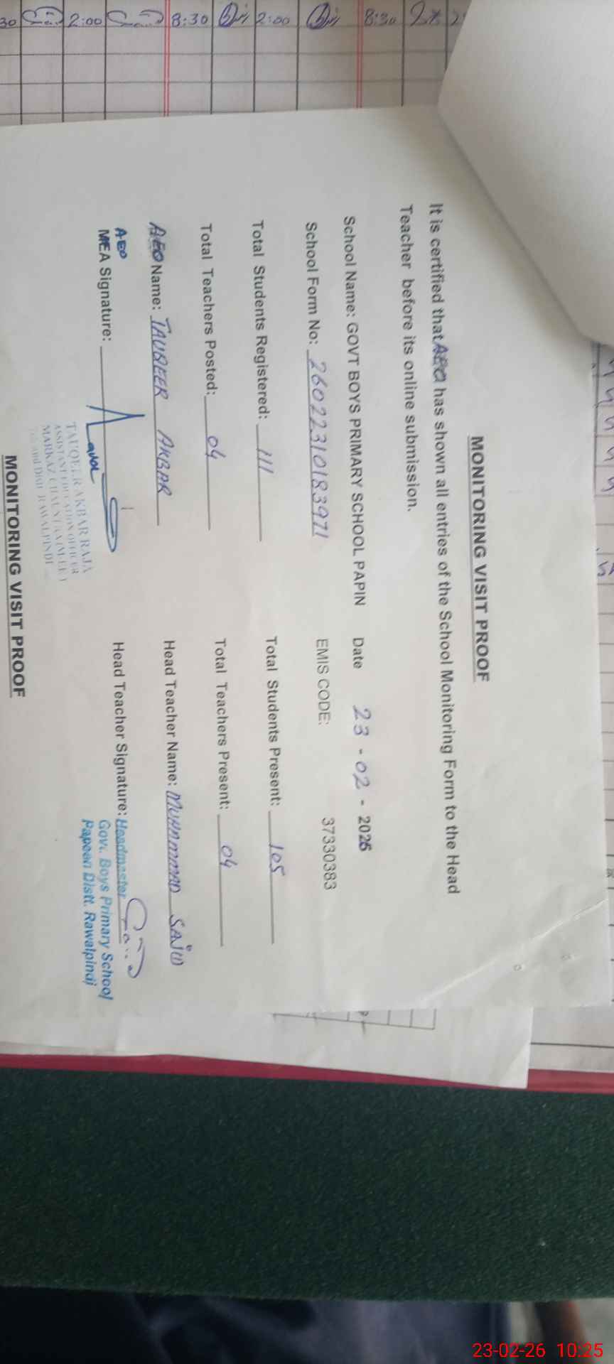 | Certified that this School was Inspected by the Undersigned MEA/DMO Today and the Information Stated Above is as Per Record. | |||||