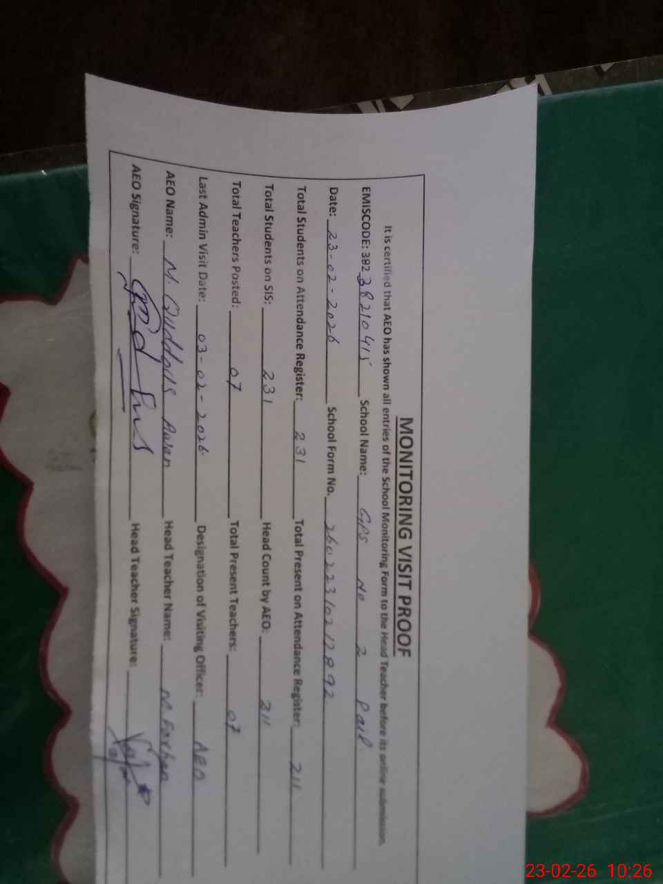 | Attendance Register | Head Teacher | MEA with School | Visit Proof |
