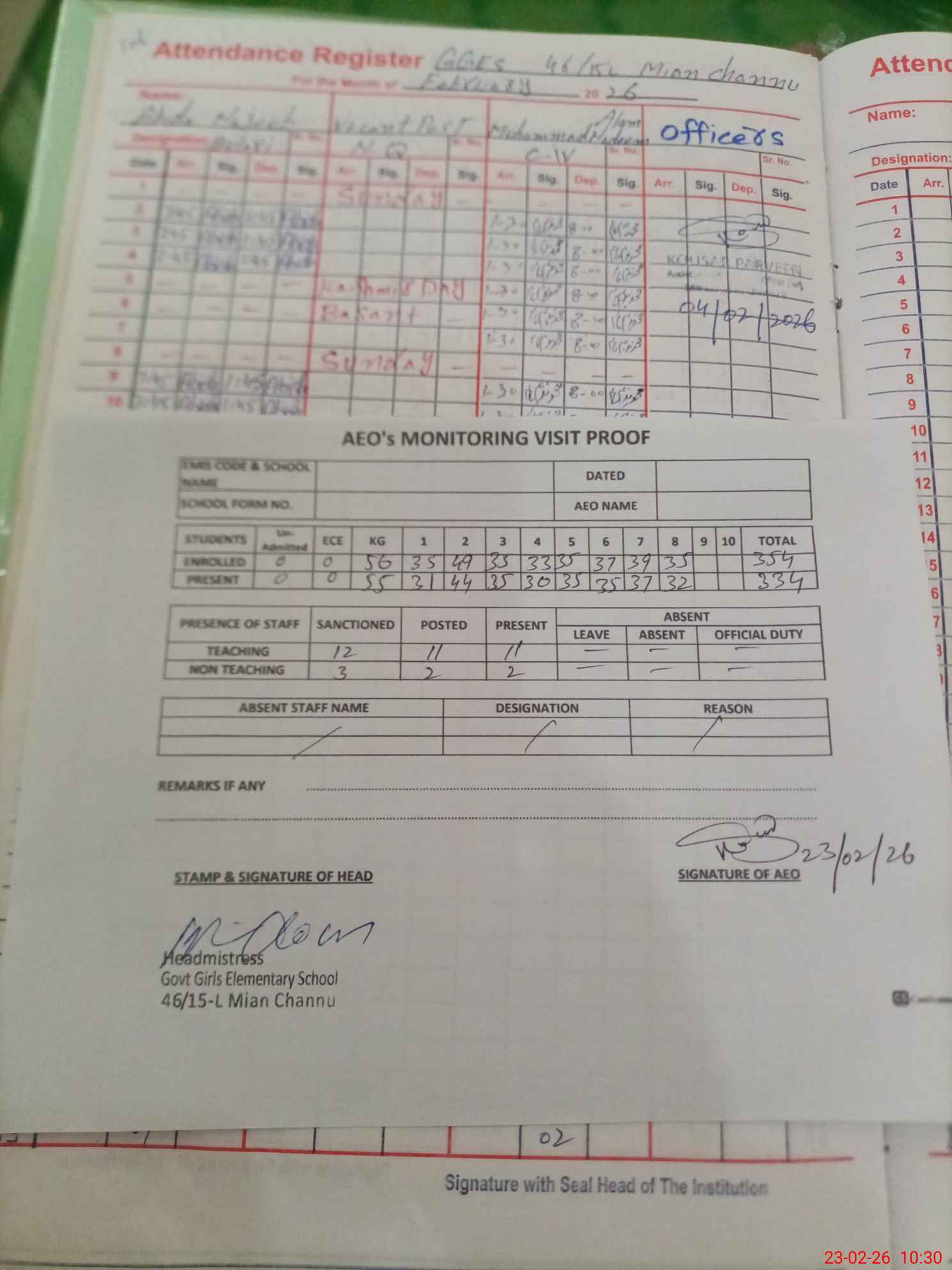 | Attendance Register | Head Teacher | MEA with School | Visit Proof |