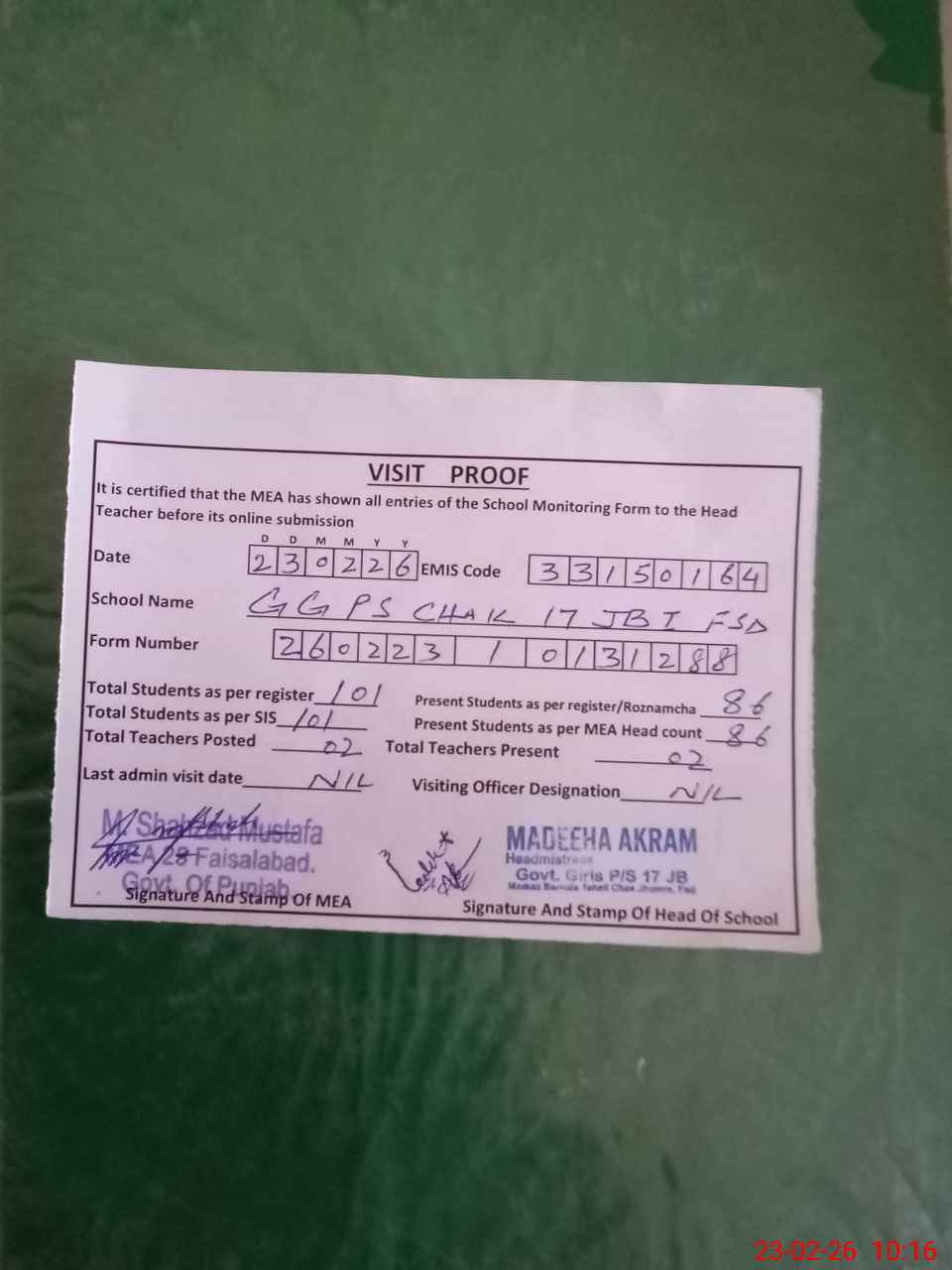 | Attendance Register | Head Teacher | MEA with School | Visit Proof |