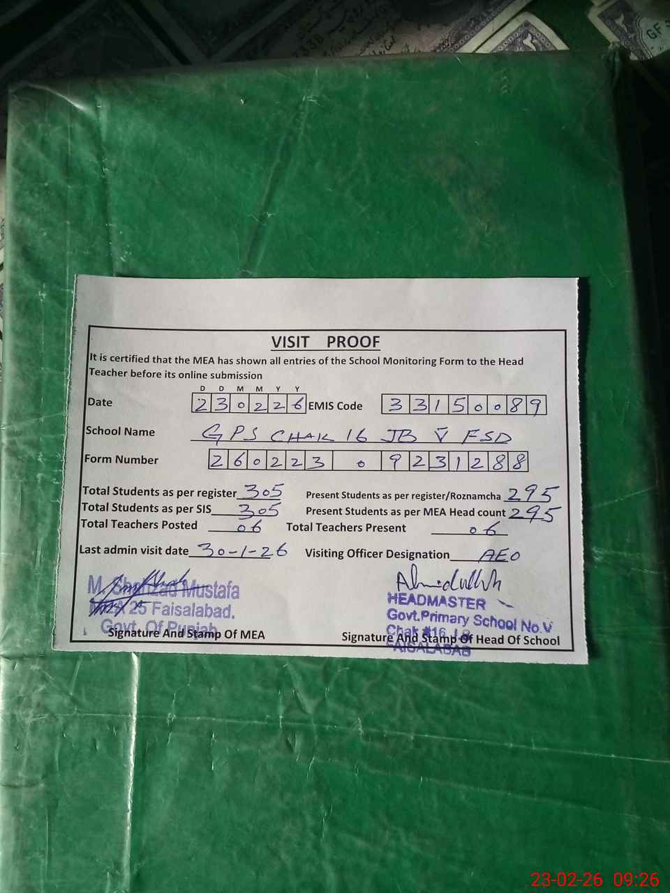 | Attendance Register | Head Teacher | MEA with School | Visit Proof |